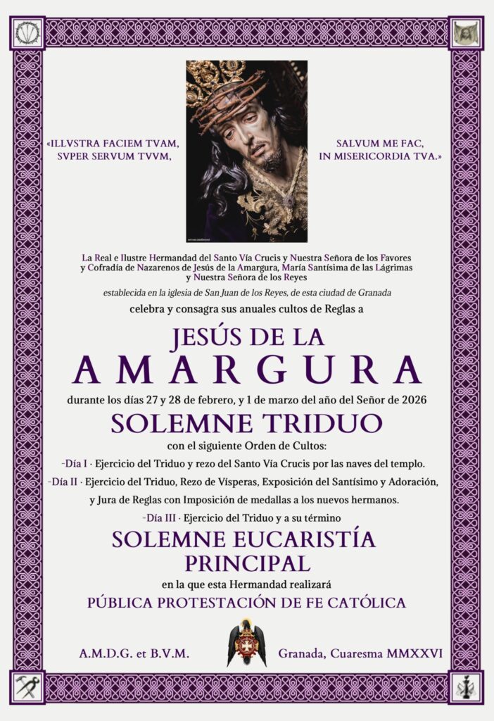 La Hermandad del Santo Vía Crucis celebra Triduo de Reglas a Jesús de la Amargura en la iglesia de San Juan de los Reyes del 27 de febrero al 1 de marzo