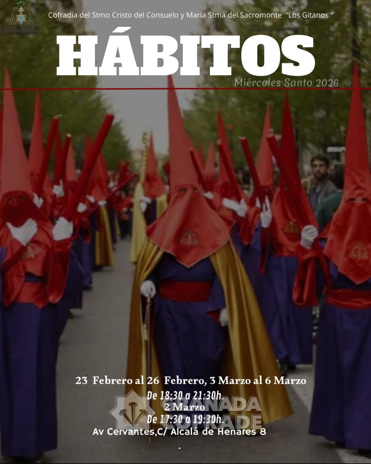 Mañana lunes se abre el plazo para la retirada de túnicas nazarenas en la hermandad del Santísimo Cristo del Consuelo (Gitanos). En horario de seis y media a nueve y media, del 23 de febrero al 26 de marzo y del 3 de marzo al 6 del mismo mes.  El día 2 de marzo el horario será de cinco y media a siete y media.