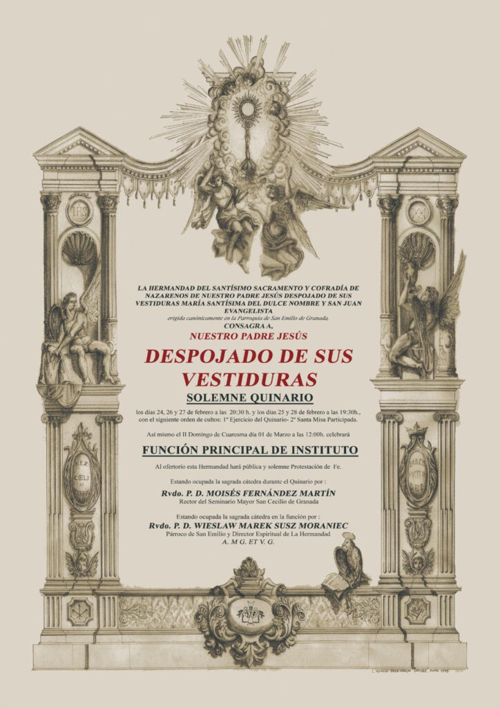 Convoca la cofradía de Nuestro Padre Jesús Despojado de sus Vestiduras el quinario en honor de su Titular desde mañana día 24, martes, hasta el sábado, 28 de febrero. Estará presidido y predicado por el sacerdote diocesano Moisés Fernández Martín, rector del Seminario Mayor San Cecilio, de Granada. El horario de las celebraciones Eucarísticas y ejercicio del quinario es el martes 24, jueves 26 y viernes, día 27 a las 20.30 horas. El miércoles día 28 y el sábado, último día de quinario será a las 20.30 horas.