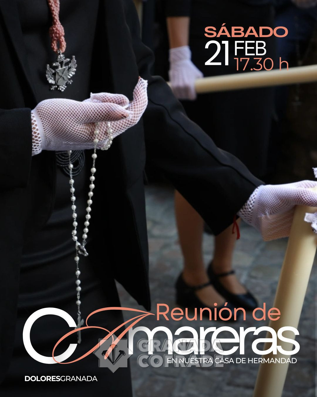 La Vocalía de Camareras de la cofradía de Nuestra Señora de los Dolores convoca a todas las hermanas camareras de Nuestra Señora de los Dolores a la reunión informativa que se celebrará el próximo sábado 21 de febrero, a las 17:30 horas, en la Casa de Hermandad, situada en la calle Escultor Antonio Martínez Olalla nº 9, locales 4 y 5, Edificio Marsella.