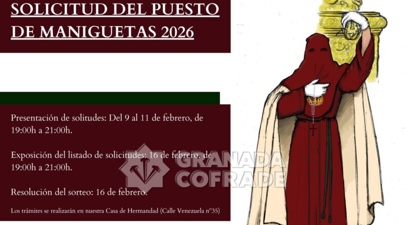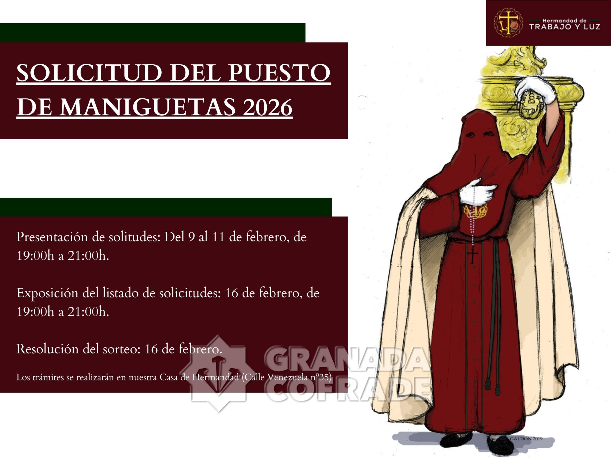 Desde mañana lunes, día 9, al miércoles 11 de febrero, se podrá solicitar los puestos de maniguetas para el presente año en la cofradía del Cristo del Trabajo y Nuestra Señora de la Luz. Se puede realizar la solicitud en la casa de hermandad de la calle Venezuela, del Zaidín y el precio es de cien euros más los cuarenta euros de cuota anual.