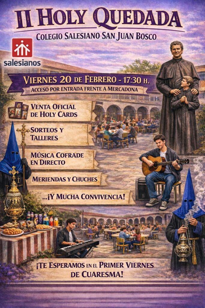 Desde la Pastoral Escolar del colegio de los Salesianos se ha organizado una actividad muy especial que celebrarán el próximo viernes, día 20 de febrero, a partir de las 17.30 horas. Durante la tarde contarán con música cofrade en directo, venta oficial de Holy Cards, sorteos y recuerdos cofrades, ocho talleres para niños y familias, kiosco con meriendas, chuches y café y, sobre todo, muchas ganas de compartir y disfrutar juntos.