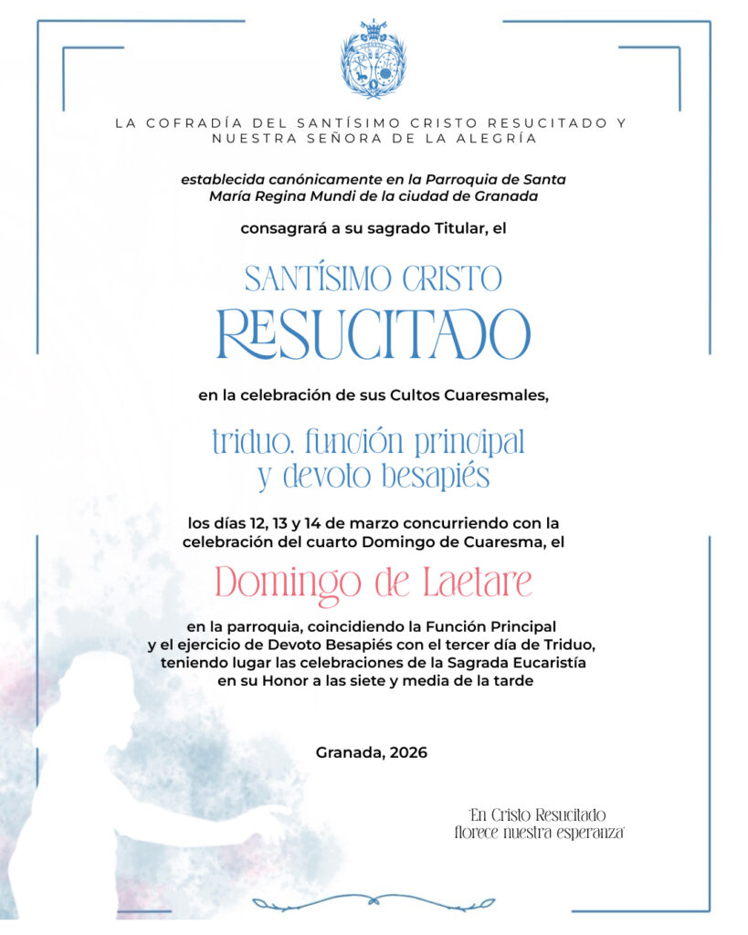 La Cofradía del Santísimo Cristo Resucitado y Nuestra Señora de la Alegría, establecida canónicamente en la parroquia de Santa María Regina Mundi de Granada, celebrará los próximos días 12, 13 y 14 de marzo sus cultos cuaresmales en honor a su Sagrado Titular, el Santísimo Cristo Resucitado. Los cultos consistirán en la celebración de un Solemne Triduo, que culminará con la Función Principal y el devoto besapiés a la sagrada imagen.