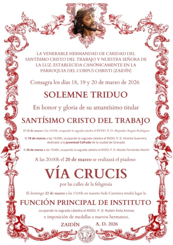 Convoca la cofradía del Santísimo Cristo del Trabajo al solemne triduo que se celebrará en su honor en el templo parroquial del Corpus Christi a partir de esta tarde, a las siete y predicado por el párroco del Varadero de Motril, Alejandro Anguis Rodríguez. Mañana jueves será presidido por el párroco, Vicente Guerrero, y estará dedicado a la juventud cofrade. El último día del triduo, viernes, será por Moisés Fernández, rector del Seminario Mayor de San Cecilio. Será también a las siete porque a las ocho de la noche tendrá lugar el rezo del Vía Crucis por las calles de la feligresía con la imagen del Señor del Trabajo.