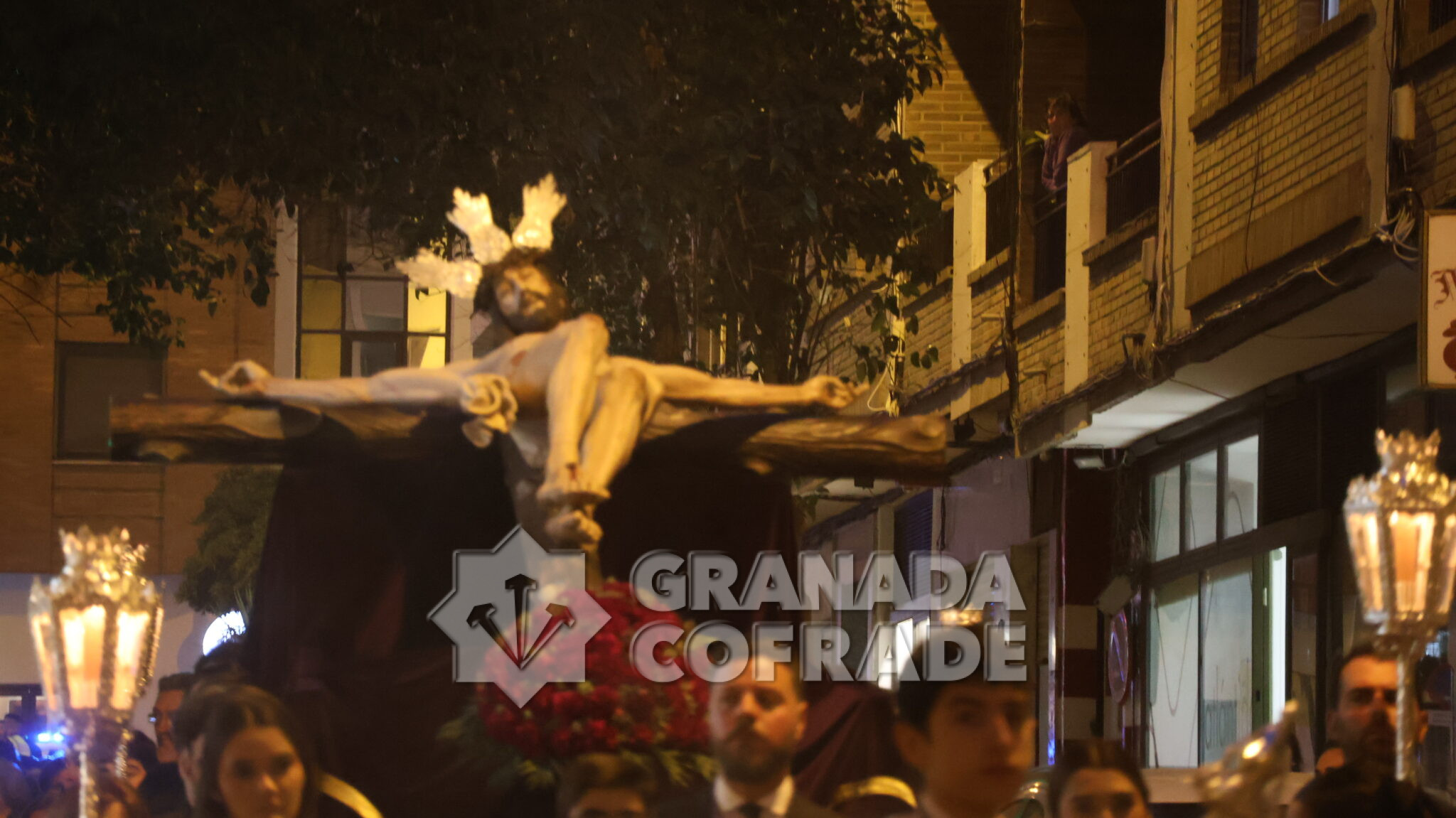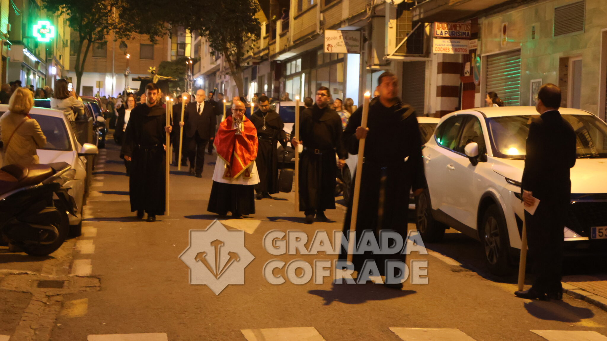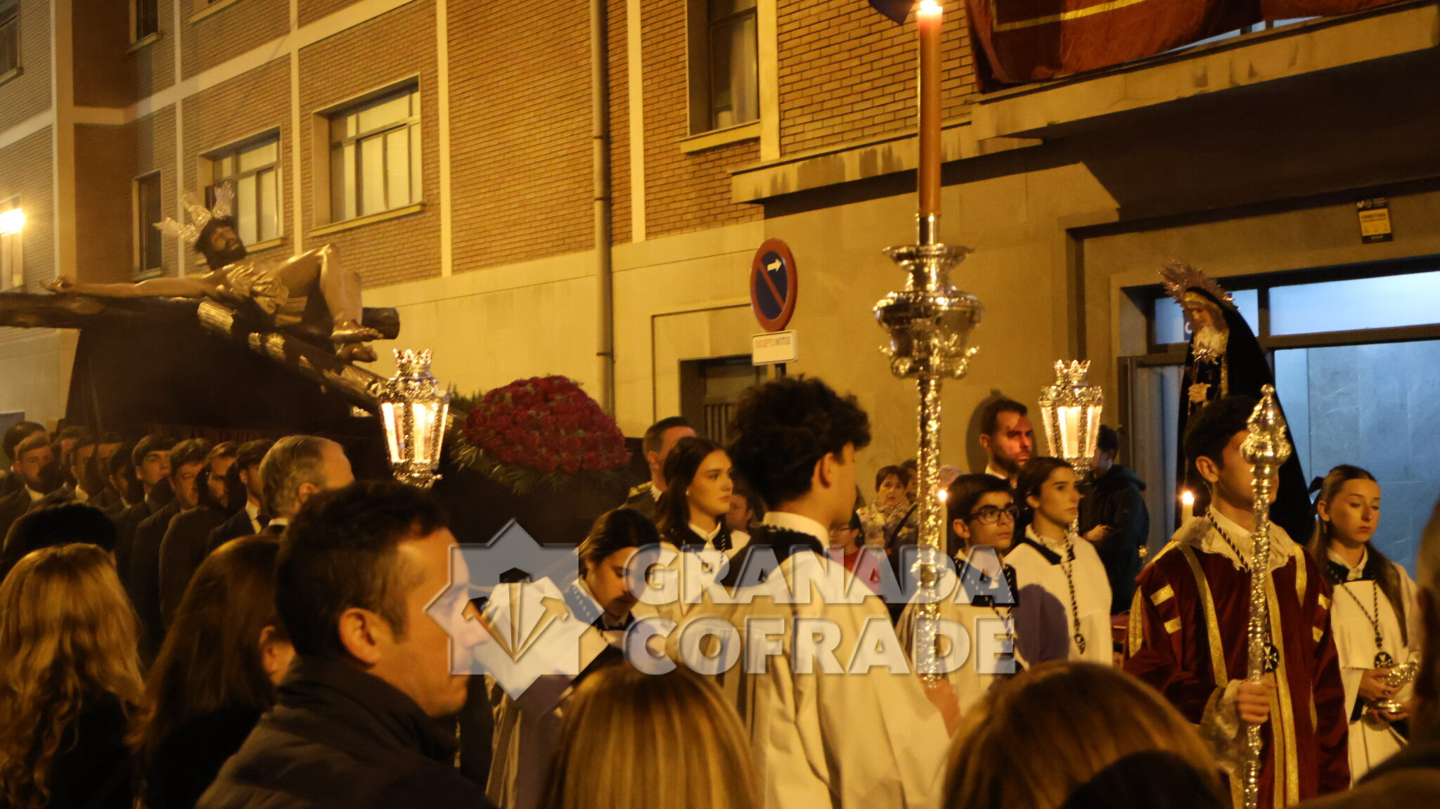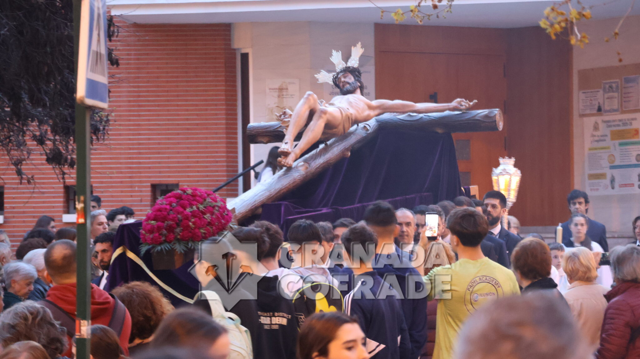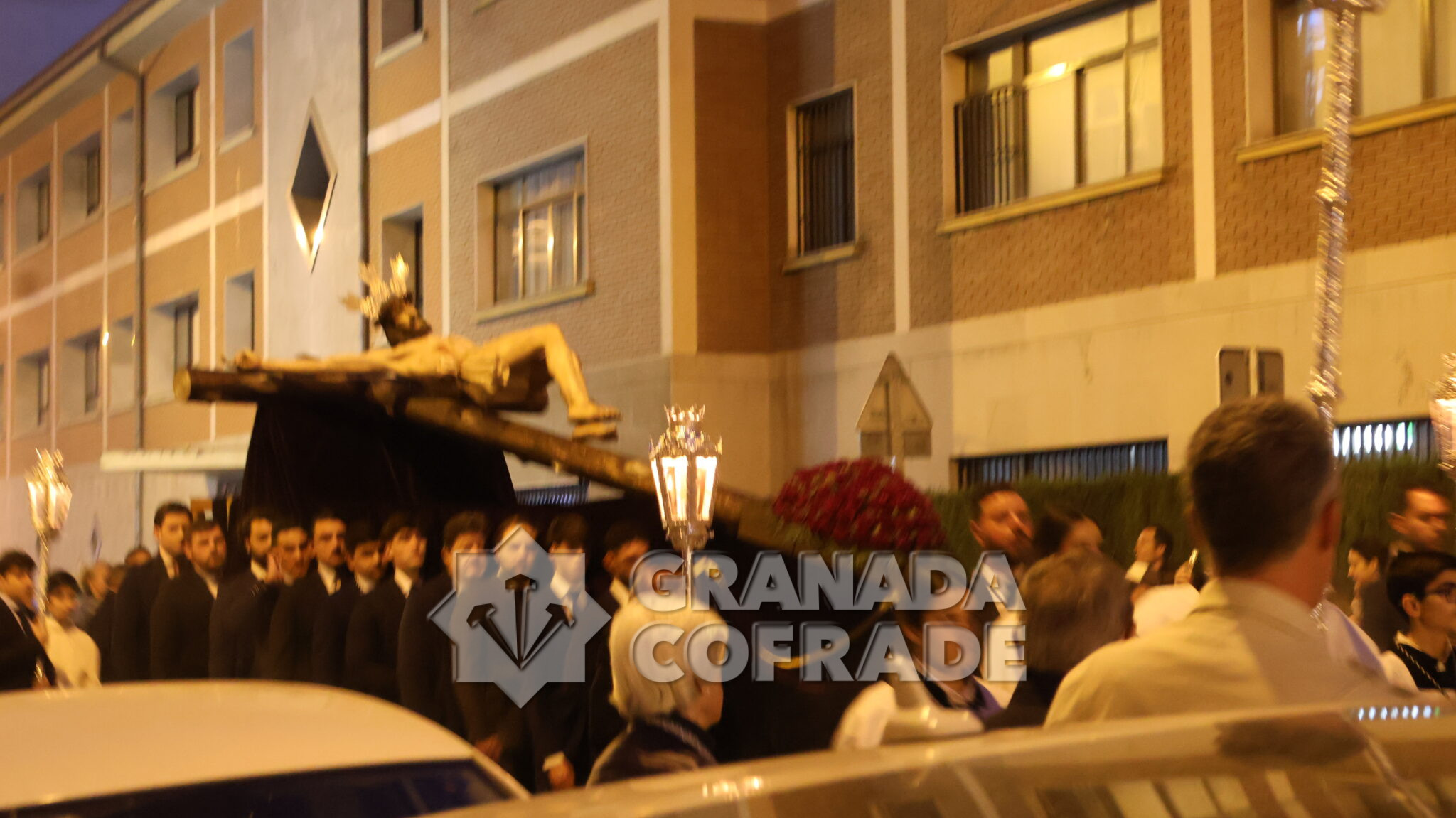 El cortejo se veía acompañado por el trio de capilla «Cristo de la Paz» de la propia corporación y en el mismo también participaban varios sacerdotes agustinos y el sacerdote de la congregación, Francisco Ariza, portaba el Lignum Crucis cedido por la comunidad agustina del Corpus Christi (Hospitalicos), de calle Elvira. La imagen del Crucificado de la Paz, mandada por su capataz David Barranco, se adornaba con un sencillo centro a los pies de la cruz, de claveles rojos, y escoltado por faroles de orfebrería. La comitiva religiosa la presidía el párroco y consiliario Ángel Antonio García Cuadrado, de la orden de Agustinos Recoletos.