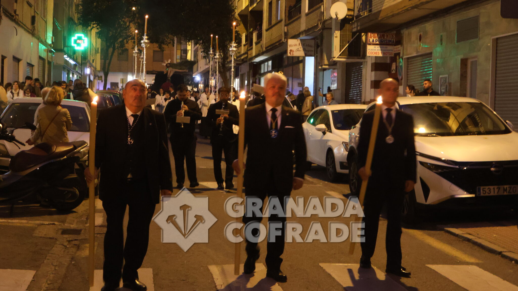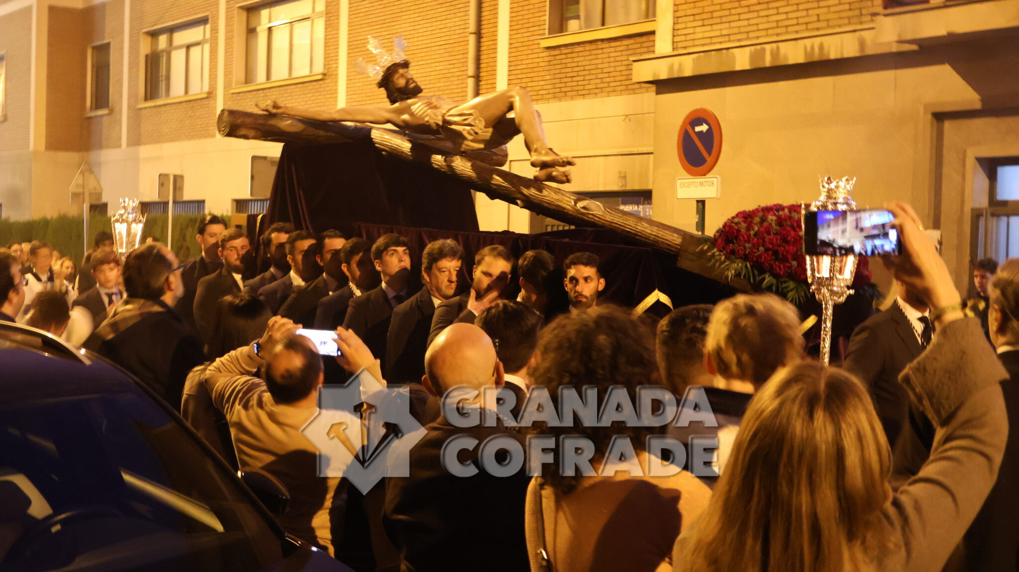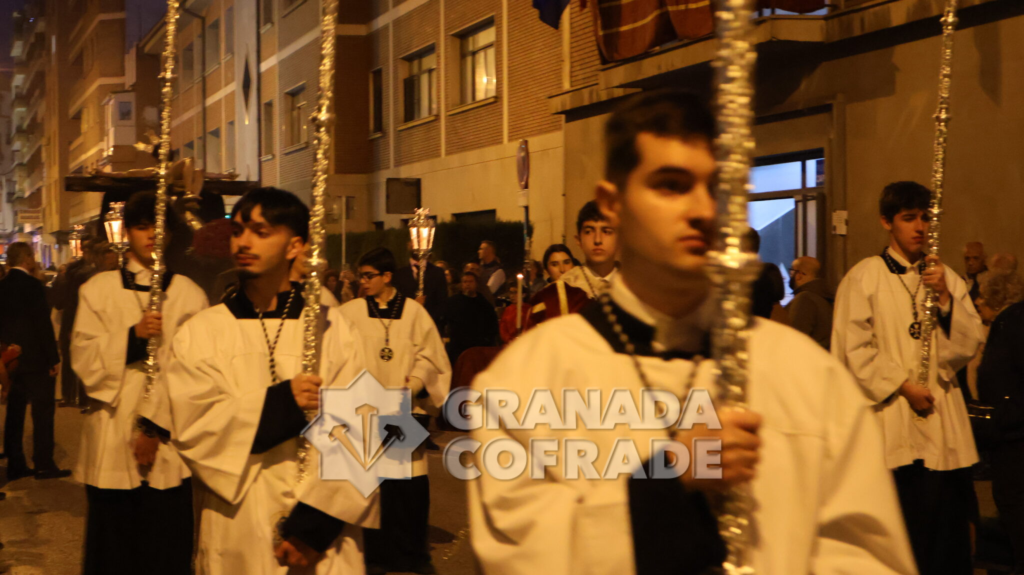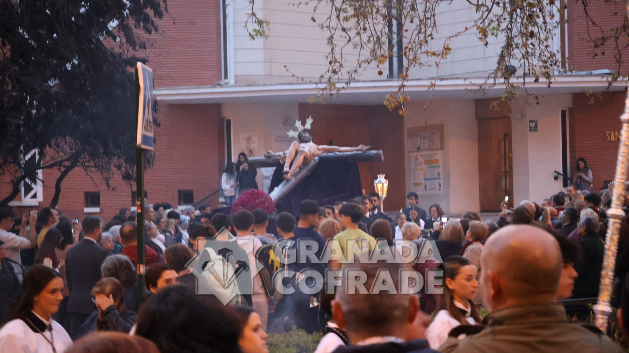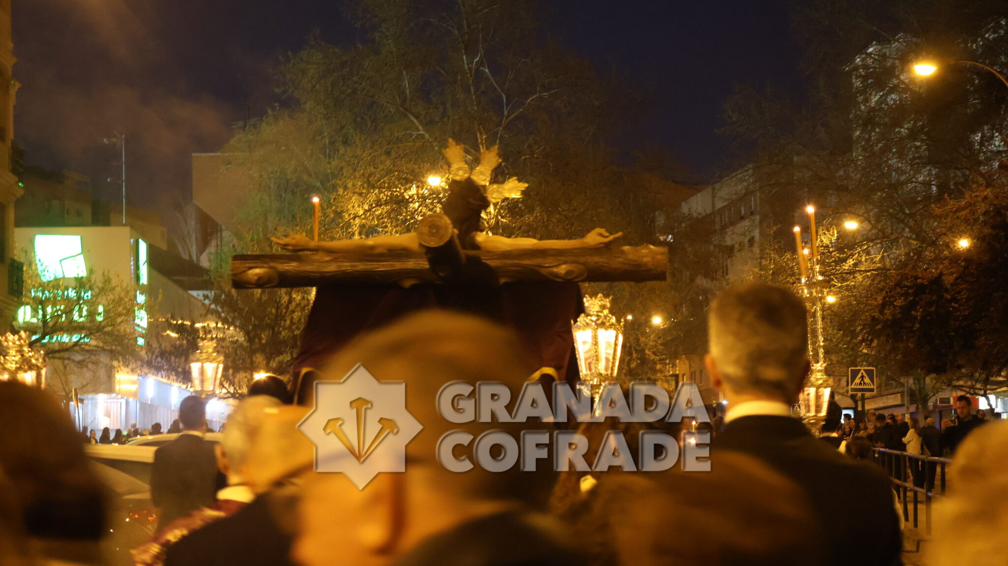 El cortejo se veía acompañado por el trio de capilla «Cristo de la Paz» de la propia corporación y en el mismo también participaban varios sacerdotes agustinos y el sacerdote de la congregación, Francisco Ariza, portaba el Lignum Crucis cedido por la comunidad agustina del Corpus Christi (Hospitalicos), de calle Elvira. La imagen del Crucificado de la Paz, mandada por su capataz David Barranco, se adornaba con un sencillo centro a los pies de la cruz, de claveles rojos, y escoltado por faroles de orfebrería. La comitiva religiosa la presidía el párroco y consiliario Ángel Antonio García Cuadrado, de la orden de Agustinos Recoletos.