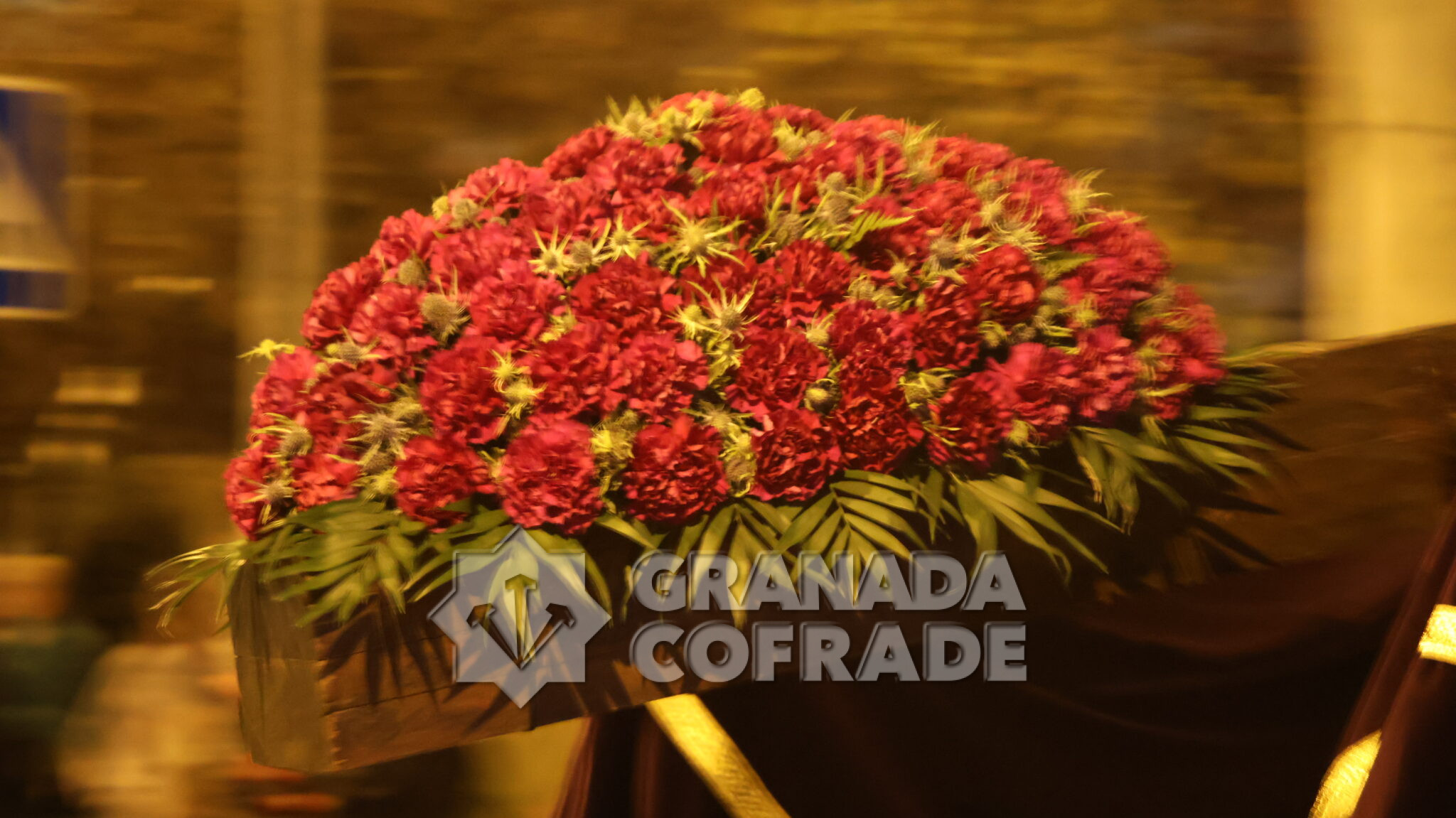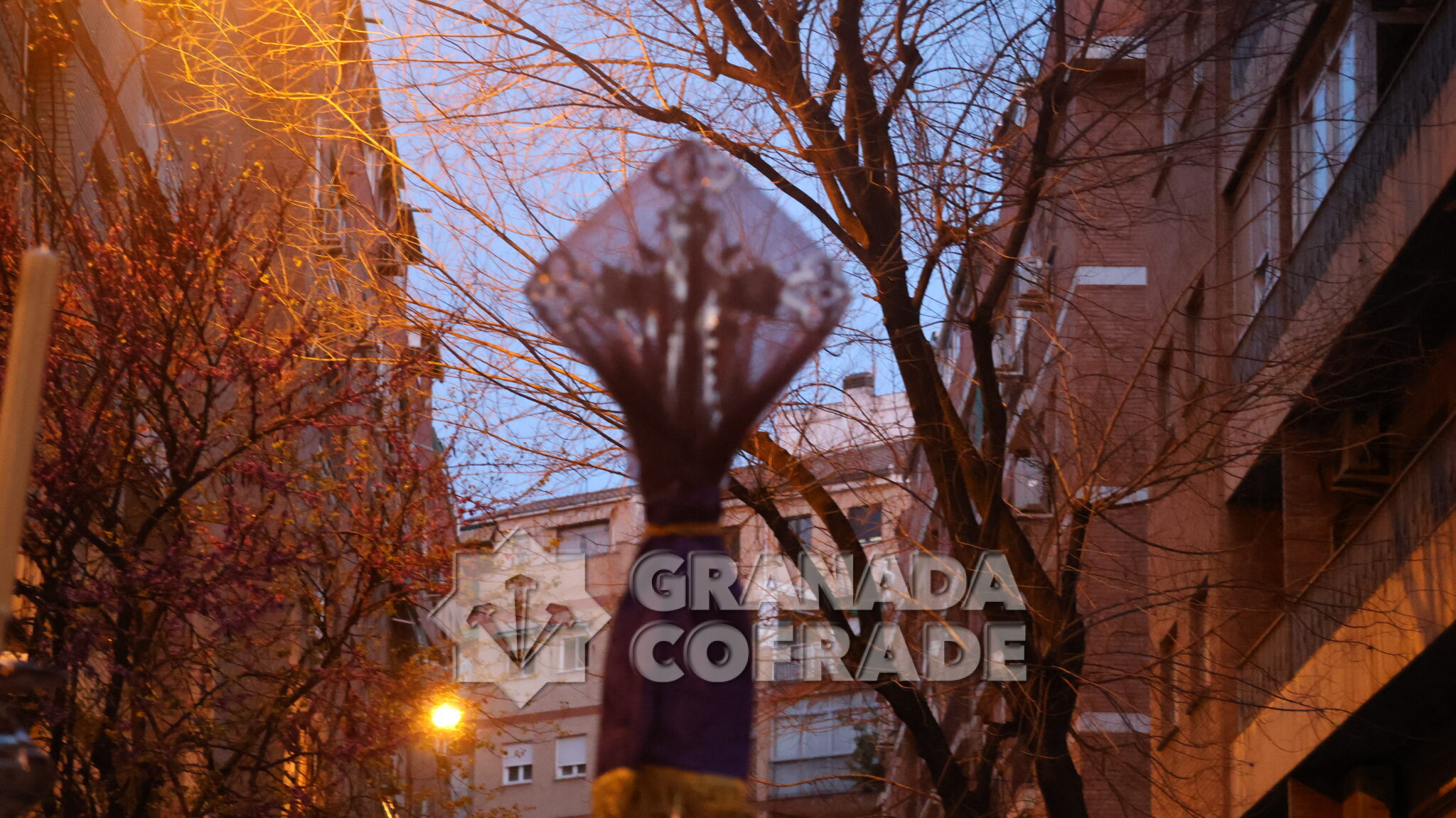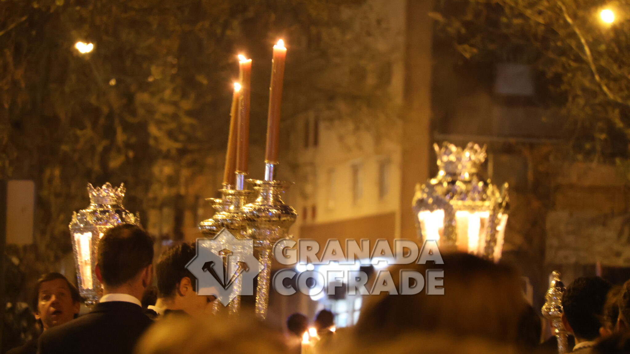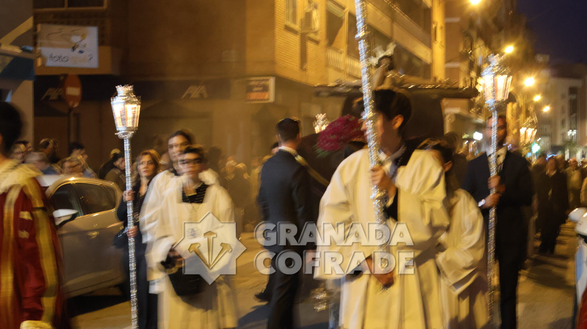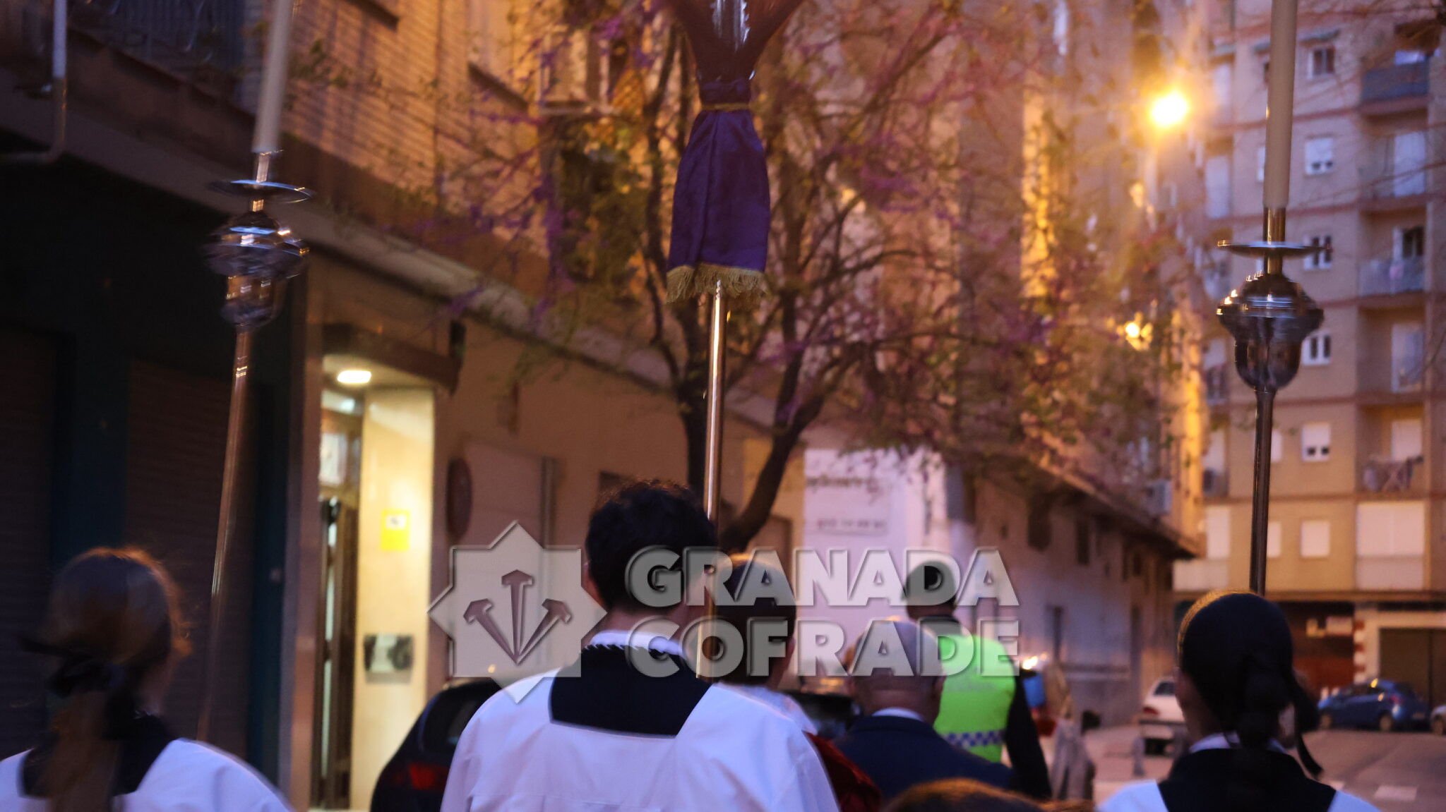 El cortejo se veía acompañado por el trio de capilla «Cristo de la Paz» de la propia corporación y en el mismo también participaban varios sacerdotes agustinos y el sacerdote de la congregación, Francisco Ariza, portaba el Lignum Crucis cedido por la comunidad agustina del Corpus Christi (Hospitalicos), de calle Elvira. La imagen del Crucificado de la Paz, mandada por su capataz David Barranco, se adornaba con un sencillo centro a los pies de la cruz, de claveles rojos, y escoltado por faroles de orfebrería. La comitiva religiosa la presidía el párroco y consiliario Ángel Antonio García Cuadrado, de la orden de Agustinos Recoletos.