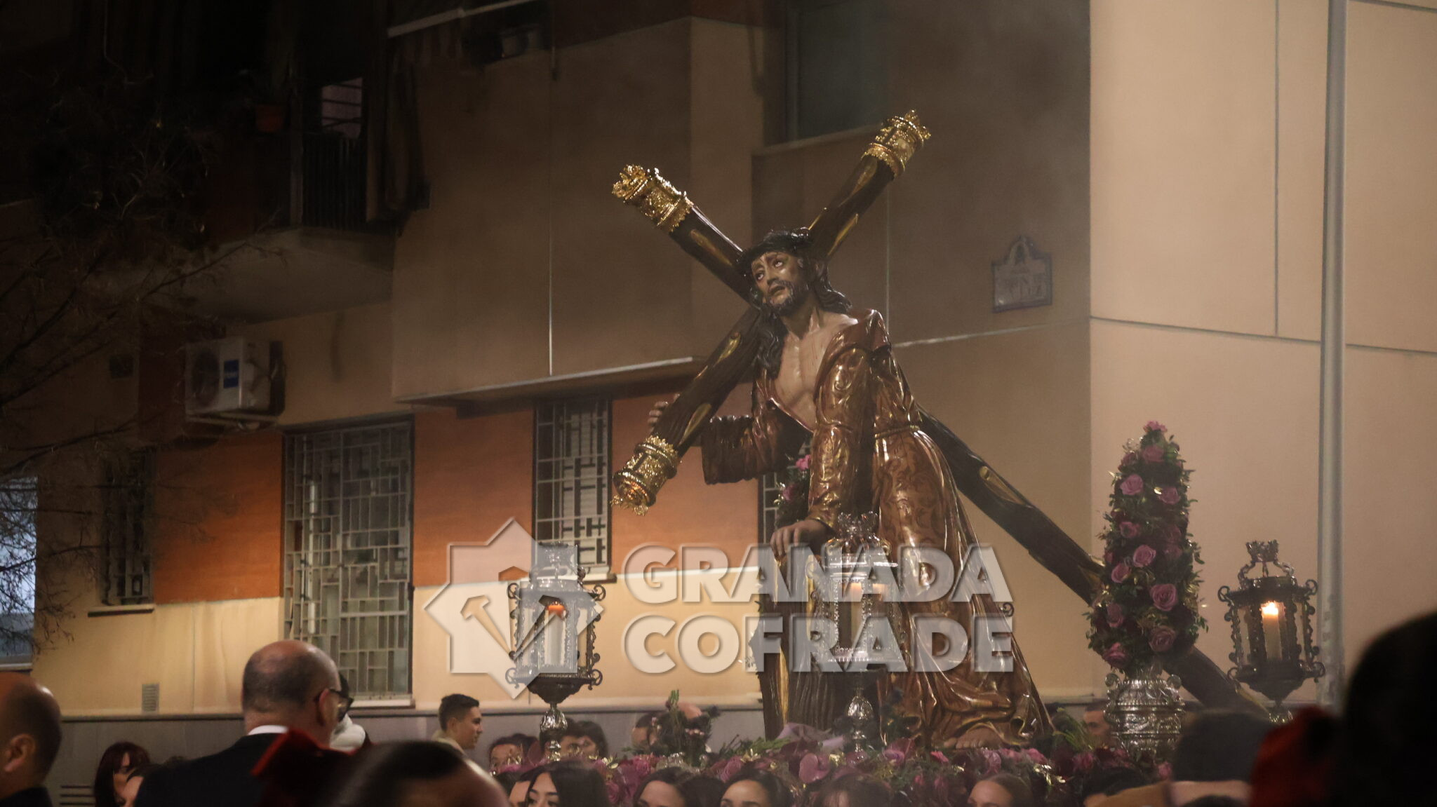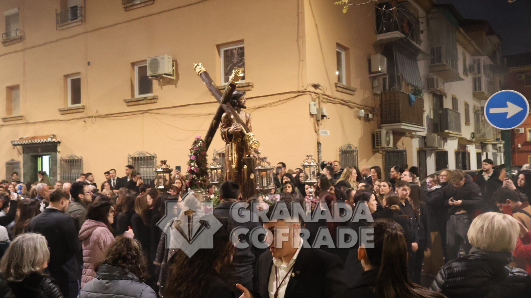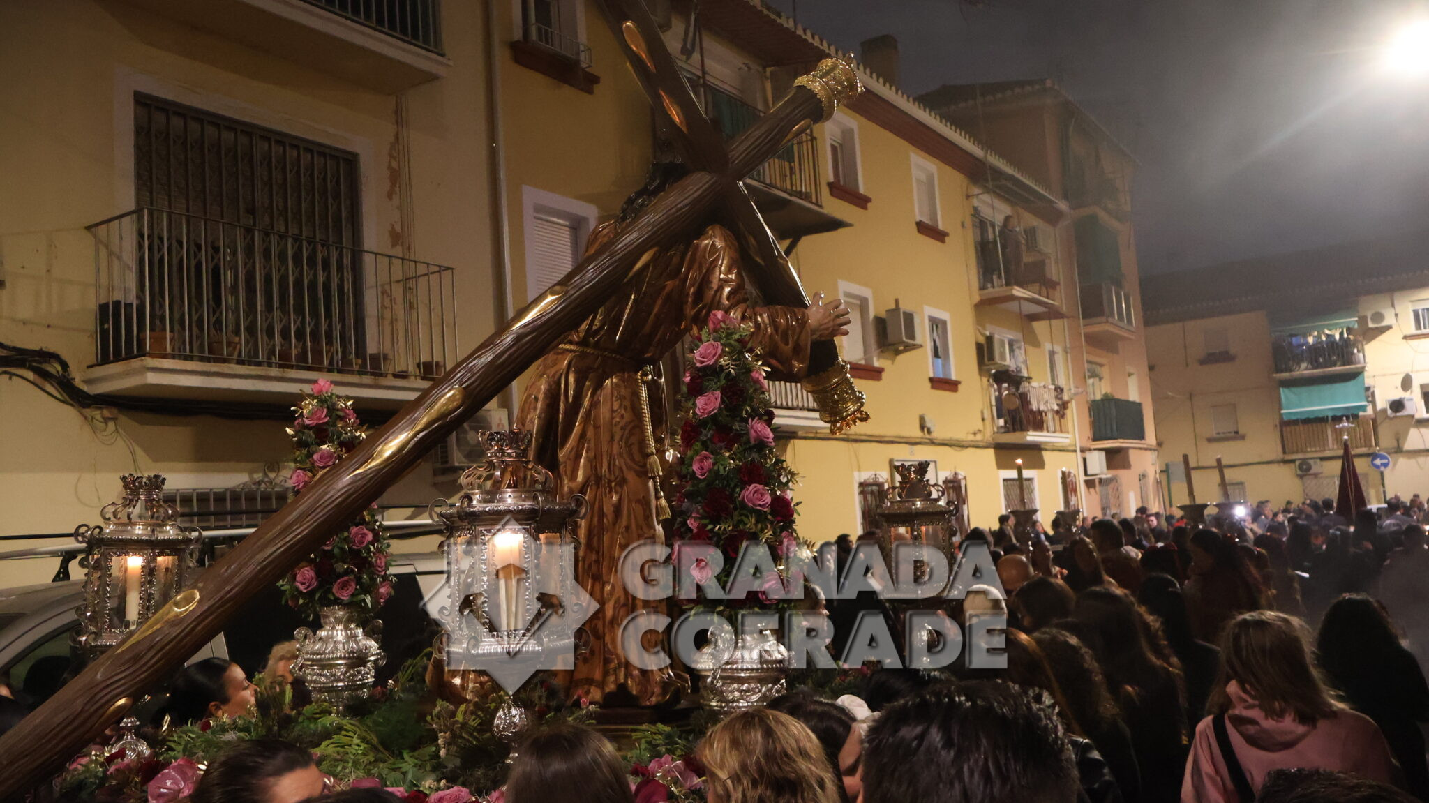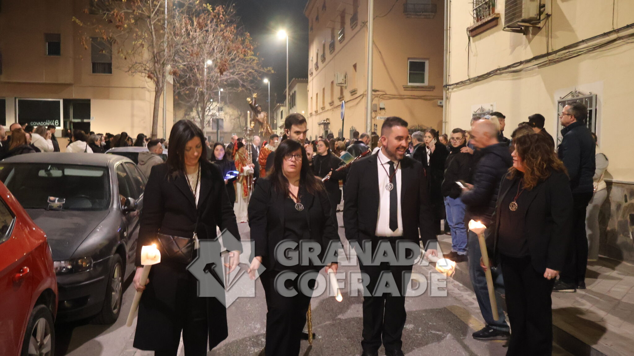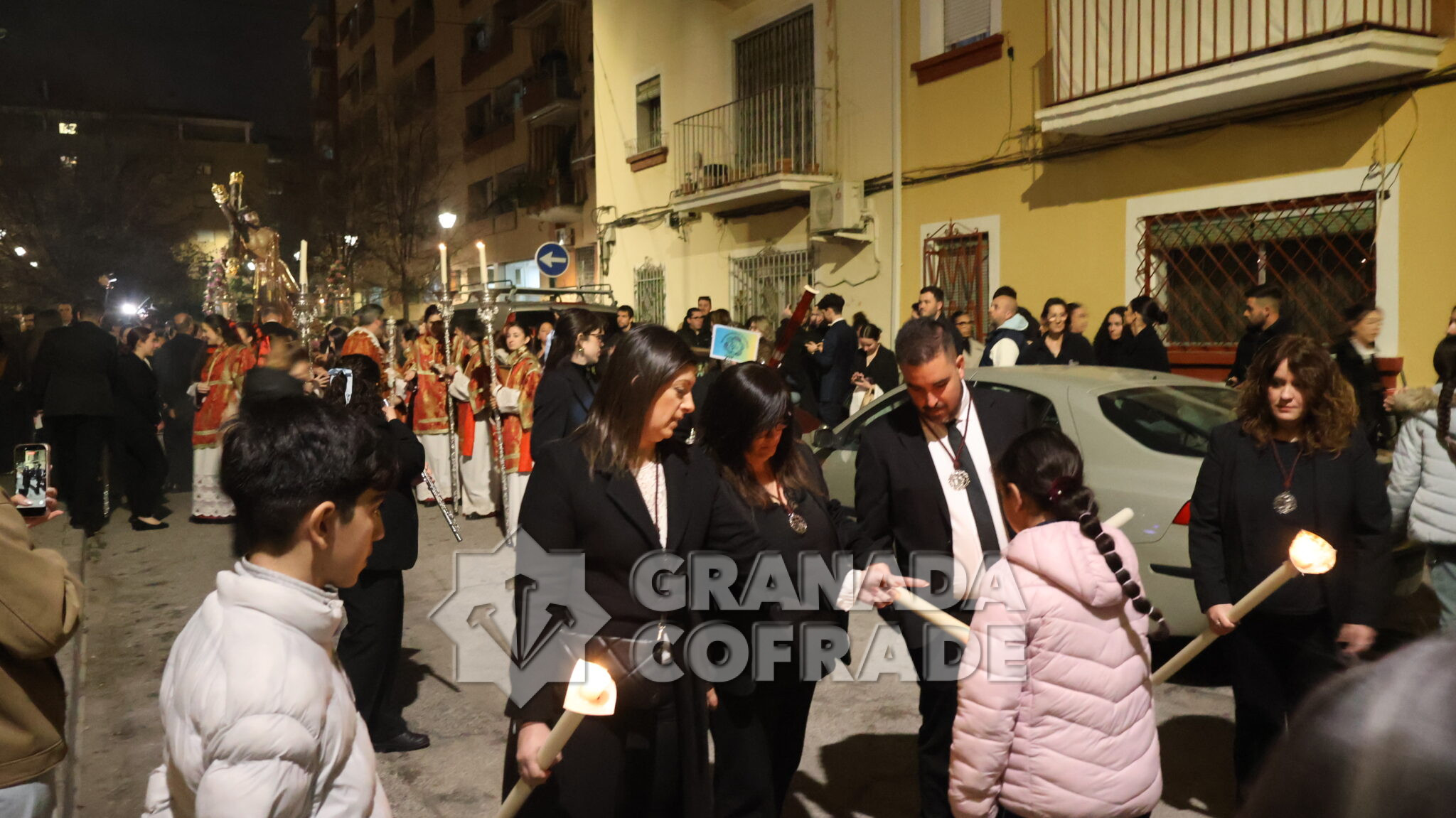 Más de cuarenta parejas de hermanos formaban en el cortejo del Vía Crucis que anoche se desarrolló por el entorno de la feligresía del Corpus Christi con la imagen del Cristo del Trabajo. Sobre andas de vía crucis y con adorno principalmente en rosas rojas y tonalidades malva, y orquídeas, marchó la imagen dentro del recogimiento propio de estas manifestaciones públicas religiosas propias de la cuaresma. Catorce estaciones que se distribuyeron por las distintas calles desde que partió del interior del templo parroquial, saliendo por calle Polinario al Zaidín, y continuar por Navarra en dirección a Garellano y Diego de Siloé. Hora y media se prolongó el rezo del Vía Crucis estando ya de regreso antes de las nueve y media de la noche. El trio de capilla «GranaMusic» participaron en el desarrollo del acto piadoso