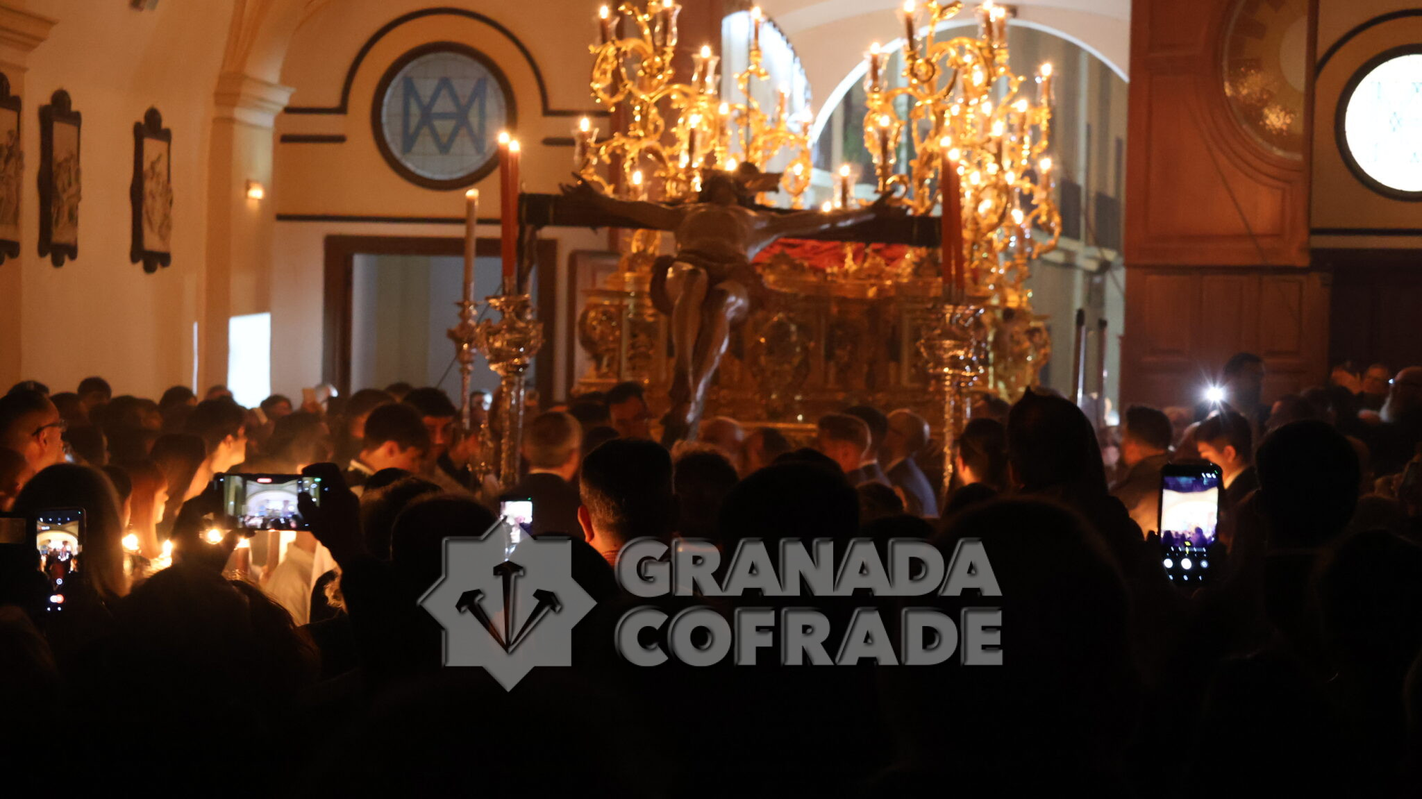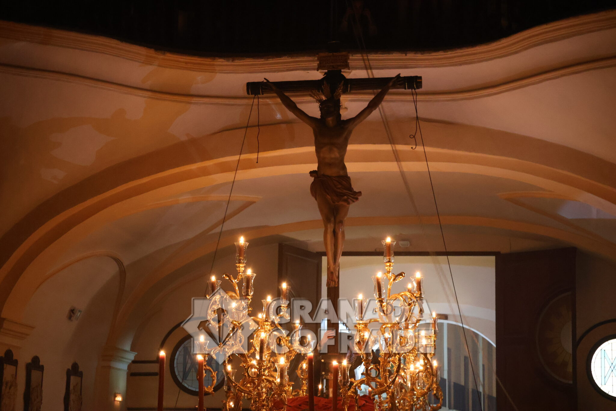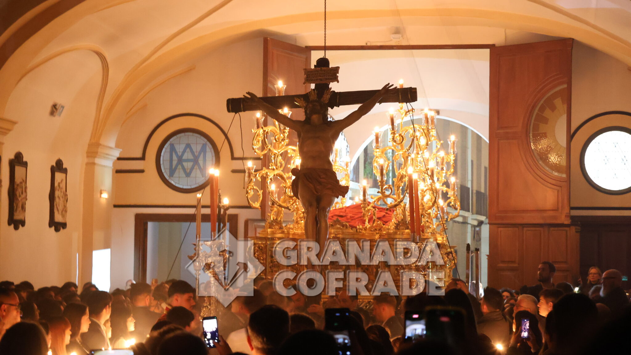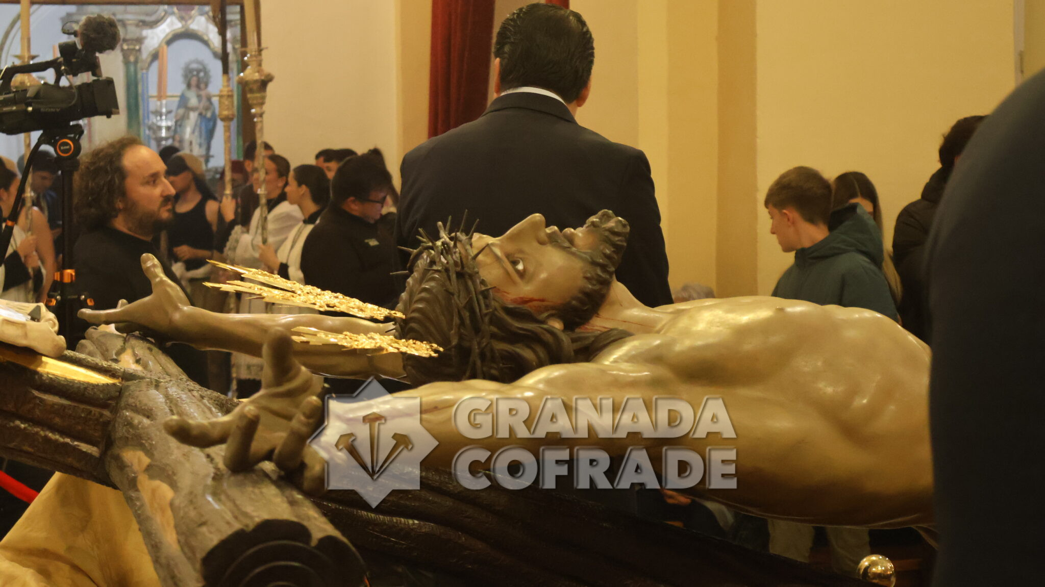 Portado por militares del Ala 78 de la Base Aérea de Armilla y con la participación del capitán Gerardo Mochón, se dispusieron a portar a la imagen del Crucificado, de Domingo Sánchez Mesa desde el presbiterio hasta el paso procesional bajo el coro del templo. Con el templo a oscuras y sólo iluminado por los ciriales del paso y la fila de hermanos jóvenes de la corporación se procedió al traslado de la imagen al paso. Estaba en el cortejo invitado el pregonero de la Semana Santa de 2026, Tito Ortiz, junto con las ediles Carolina Amate y Nani González, además de la presidencia con la hermana mayor, Fátima Sánchez, y el capitán Mochón.