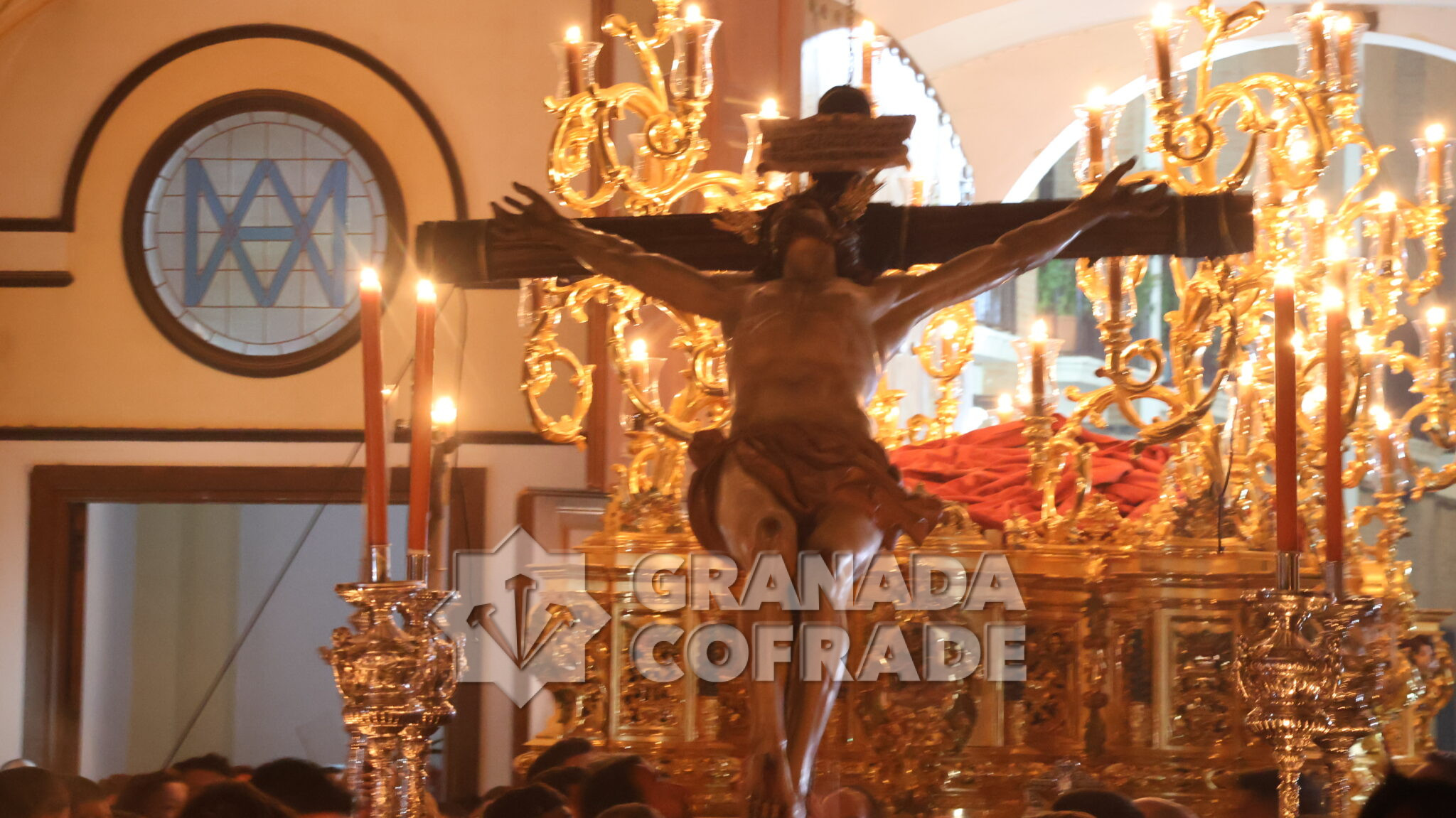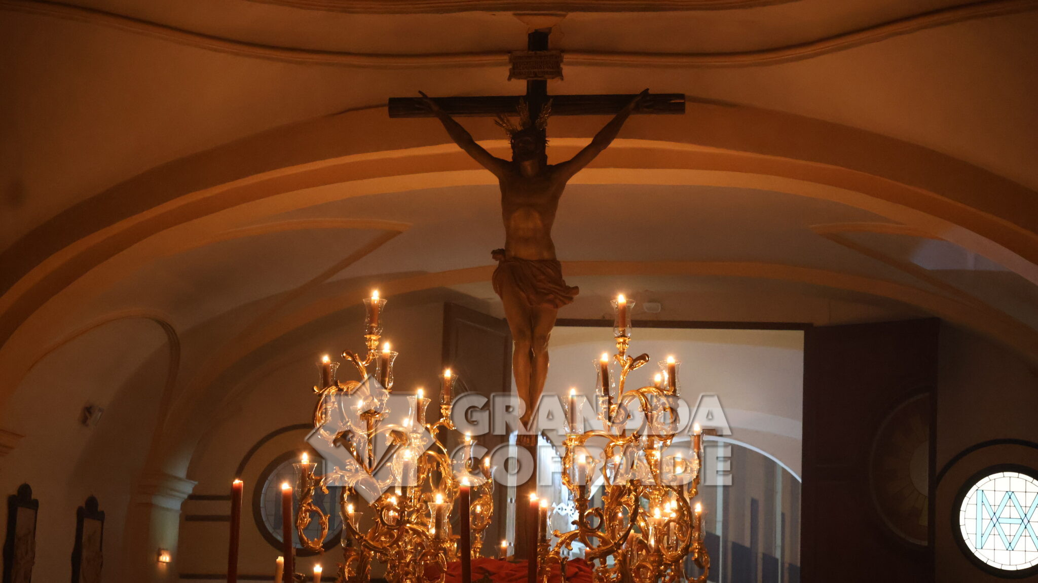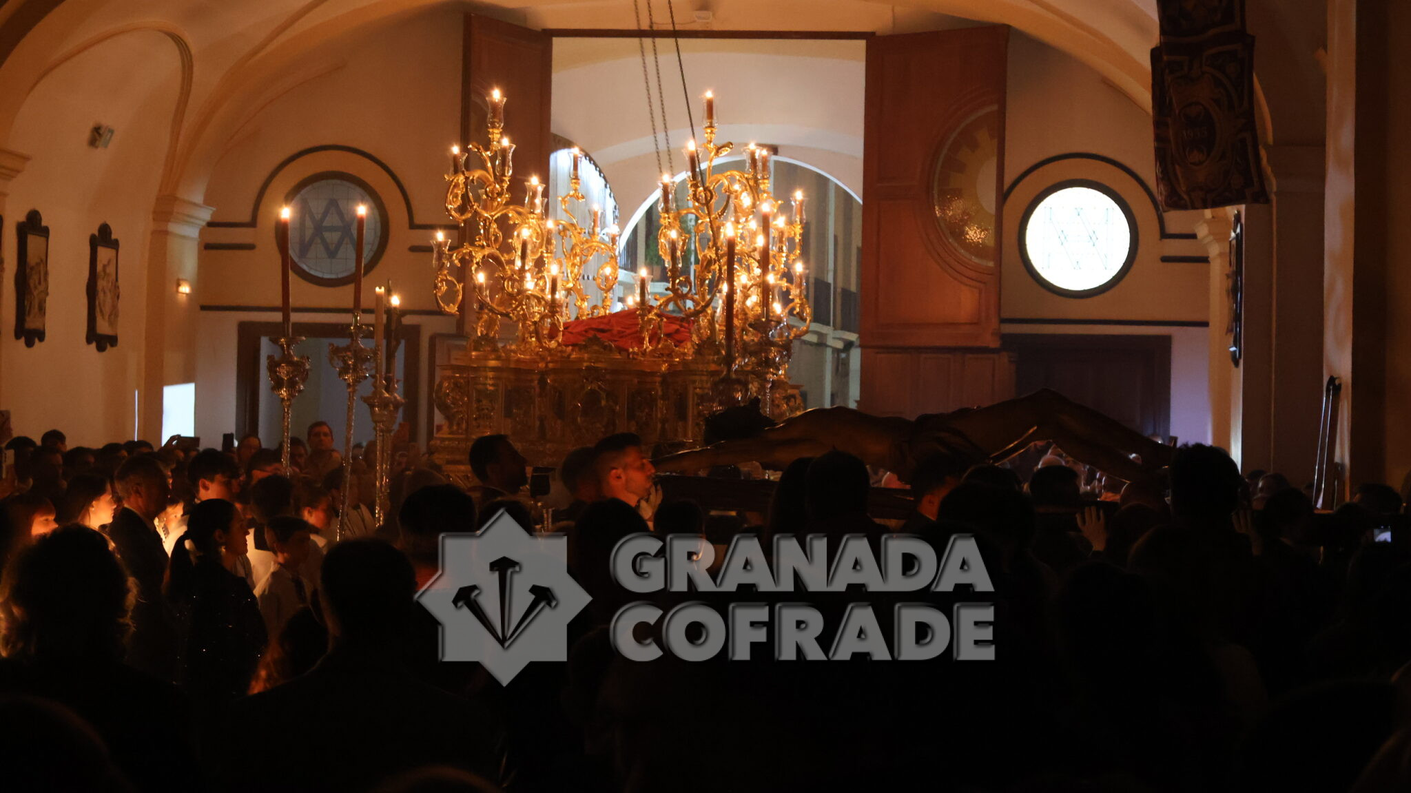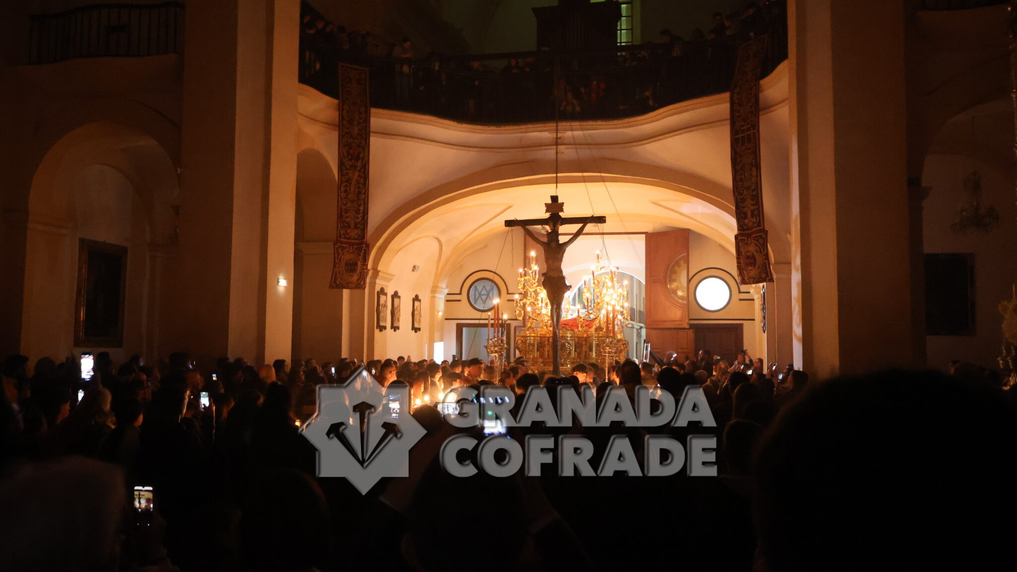 Portado por militares del Ala 78 de la Base Aérea de Armilla y con la participación del capitán Gerardo Mochón, se dispusieron a portar a la imagen del Crucificado, de Domingo Sánchez Mesa desde el presbiterio hasta el paso procesional bajo el coro del templo. Con el templo a oscuras y sólo iluminado por los ciriales del paso y la fila de hermanos jóvenes de la corporación se procedió al traslado de la imagen al paso. Estaba en el cortejo invitado el pregonero de la Semana Santa de 2026, Tito Ortiz, junto con las ediles Carolina Amate y Nani González, además de la presidencia con la hermana mayor, Fátima Sánchez, y el capitán Mochón.