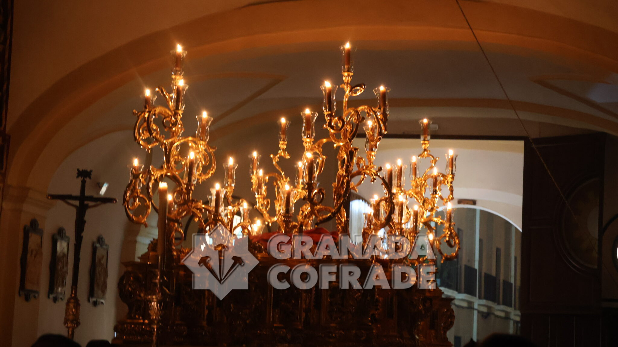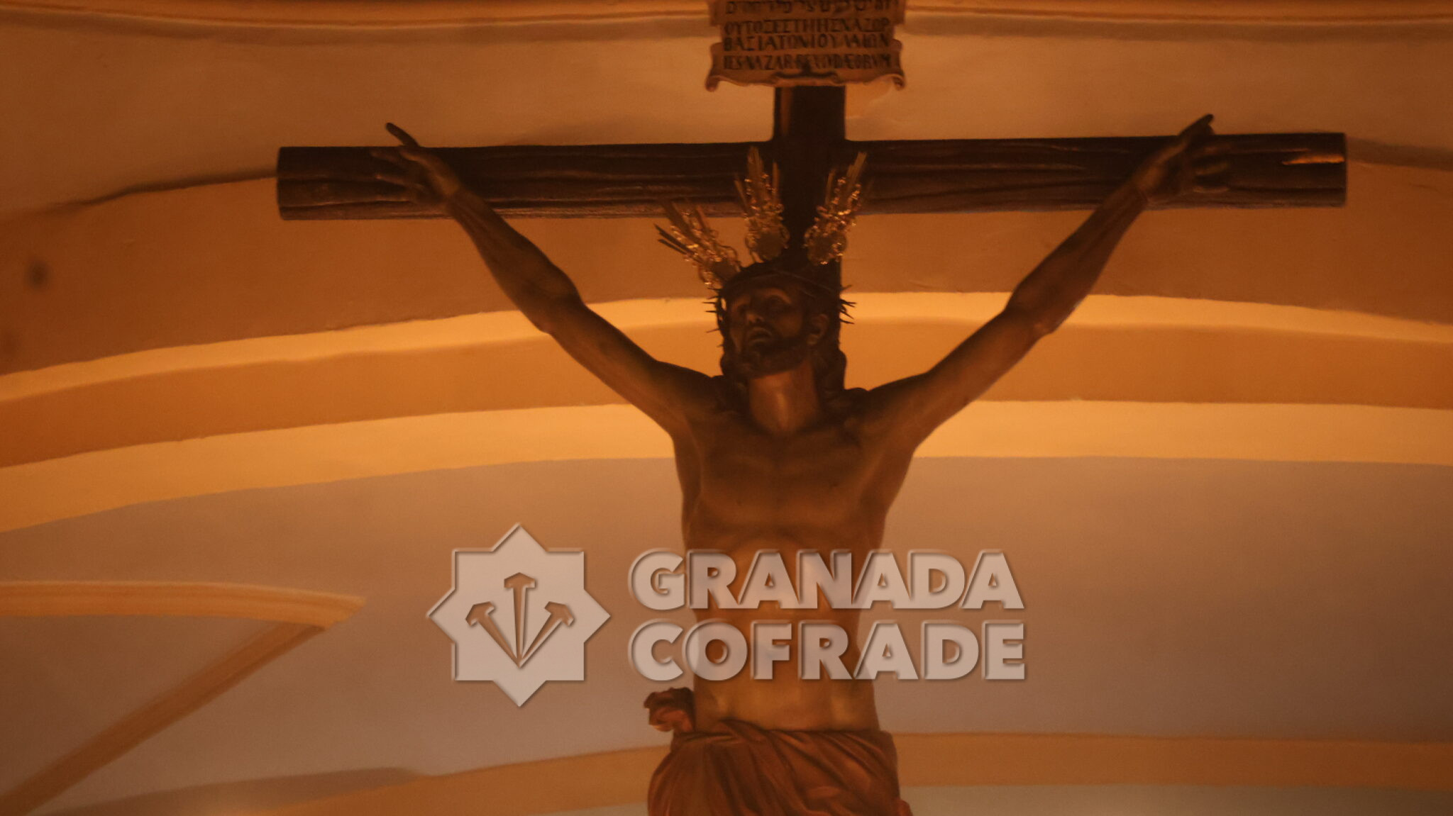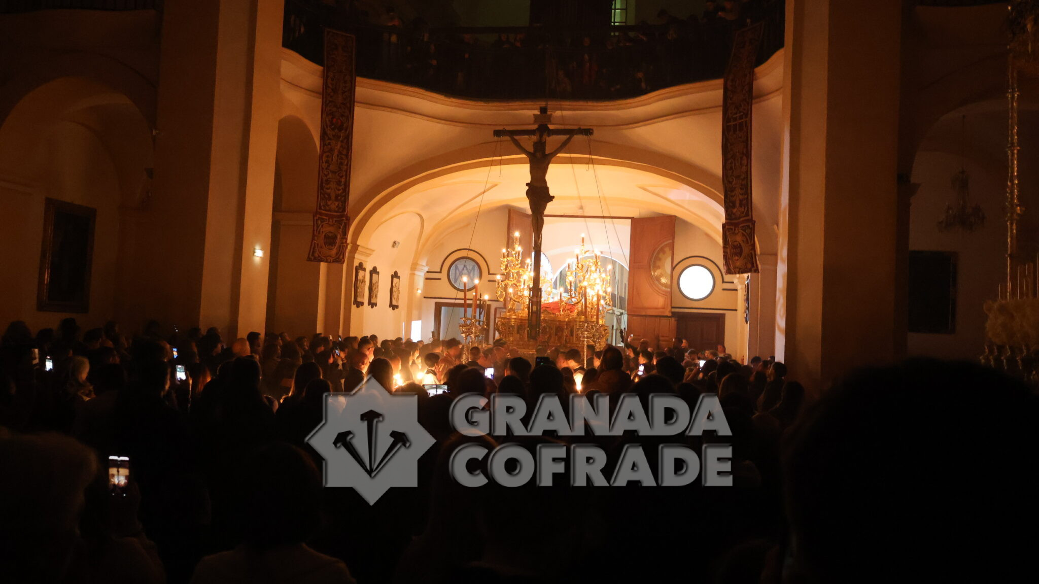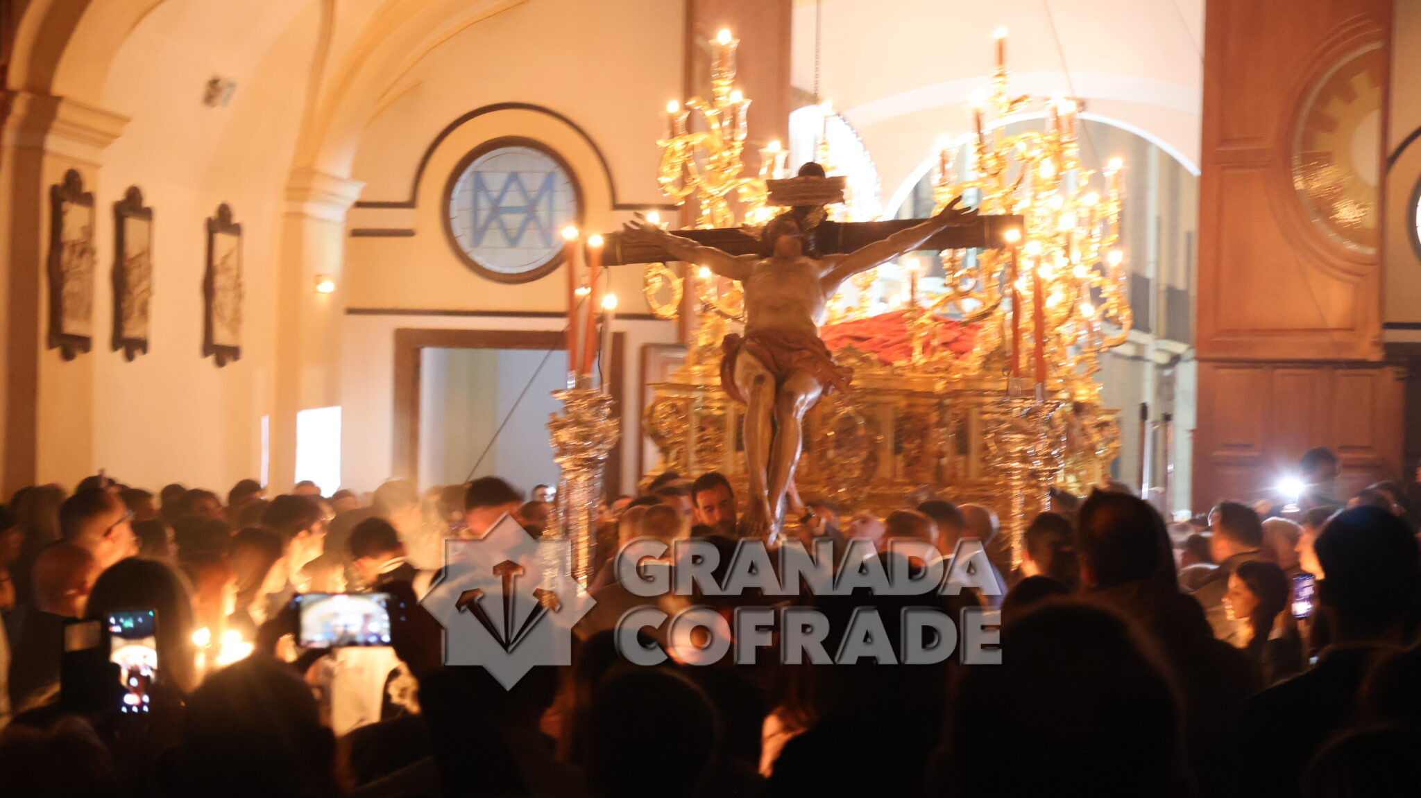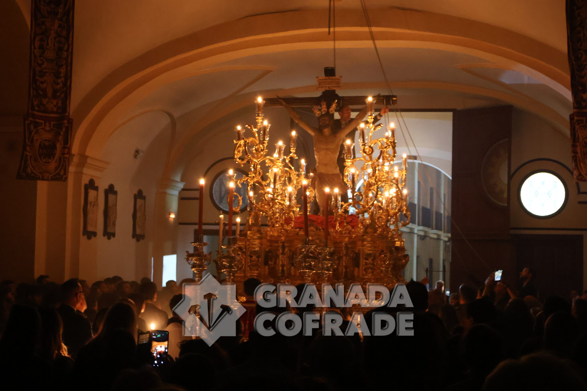 Portado por militares del Ala 78 de la Base Aérea de Armilla y con la participación del capitán Gerardo Mochón, se dispusieron a portar a la imagen del Crucificado, de Domingo Sánchez Mesa desde el presbiterio hasta el paso procesional bajo el coro del templo. Con el templo a oscuras y sólo iluminado por los ciriales del paso y la fila de hermanos jóvenes de la corporación se procedió al traslado de la imagen al paso. Estaba en el cortejo invitado el pregonero de la Semana Santa de 2026, Tito Ortiz, junto con las ediles Carolina Amate y Nani González, además de la presidencia con la hermana mayor, Fátima Sánchez, y el capitán Mochón.