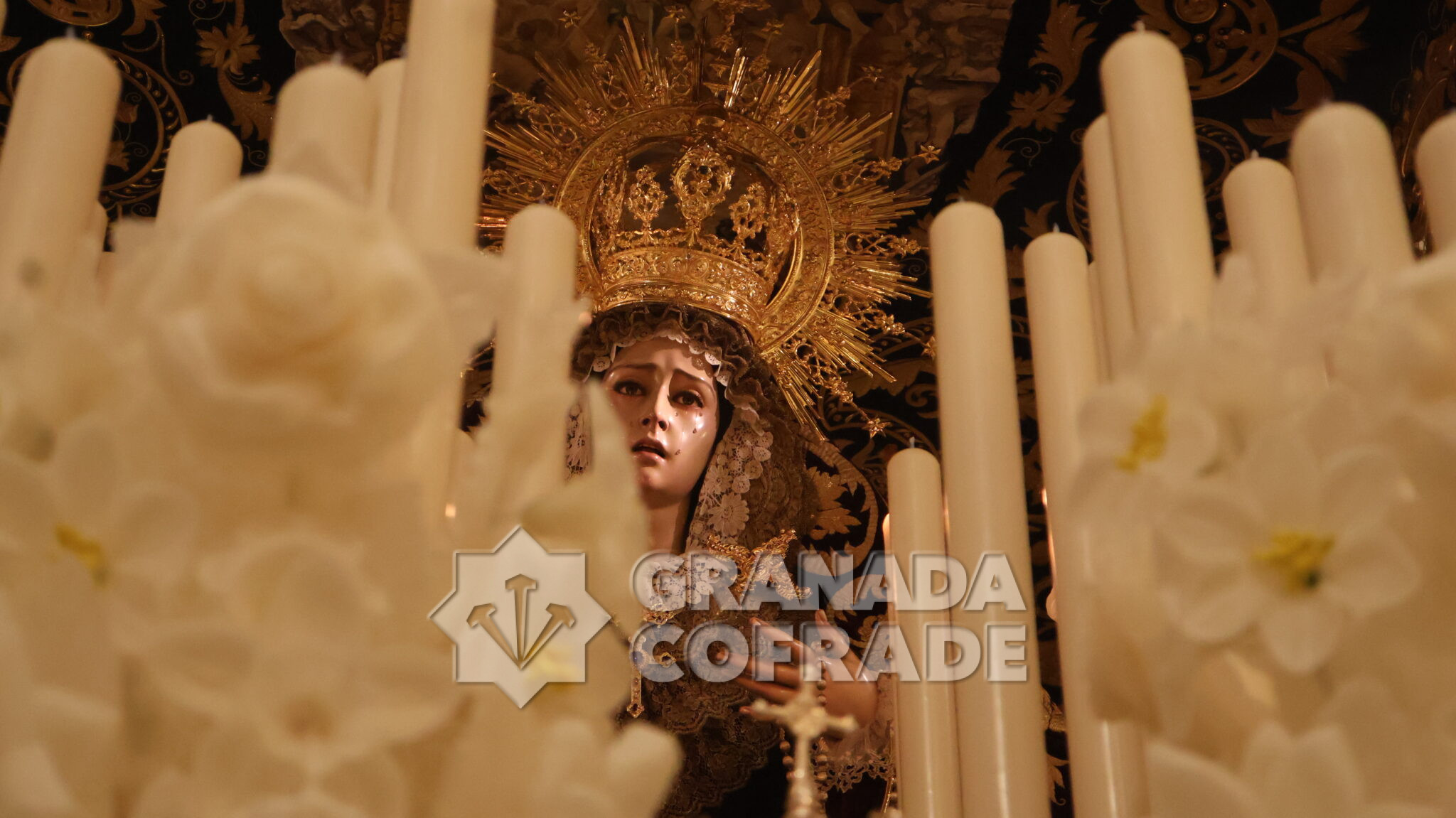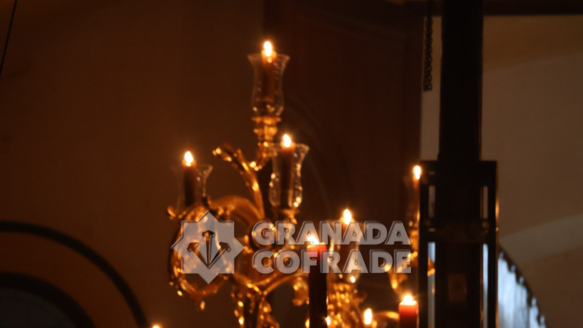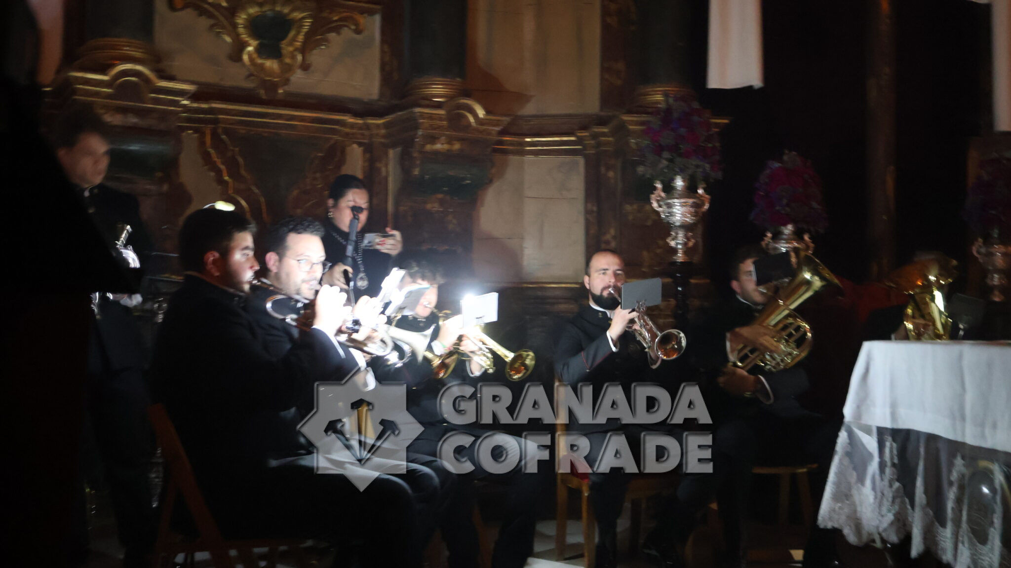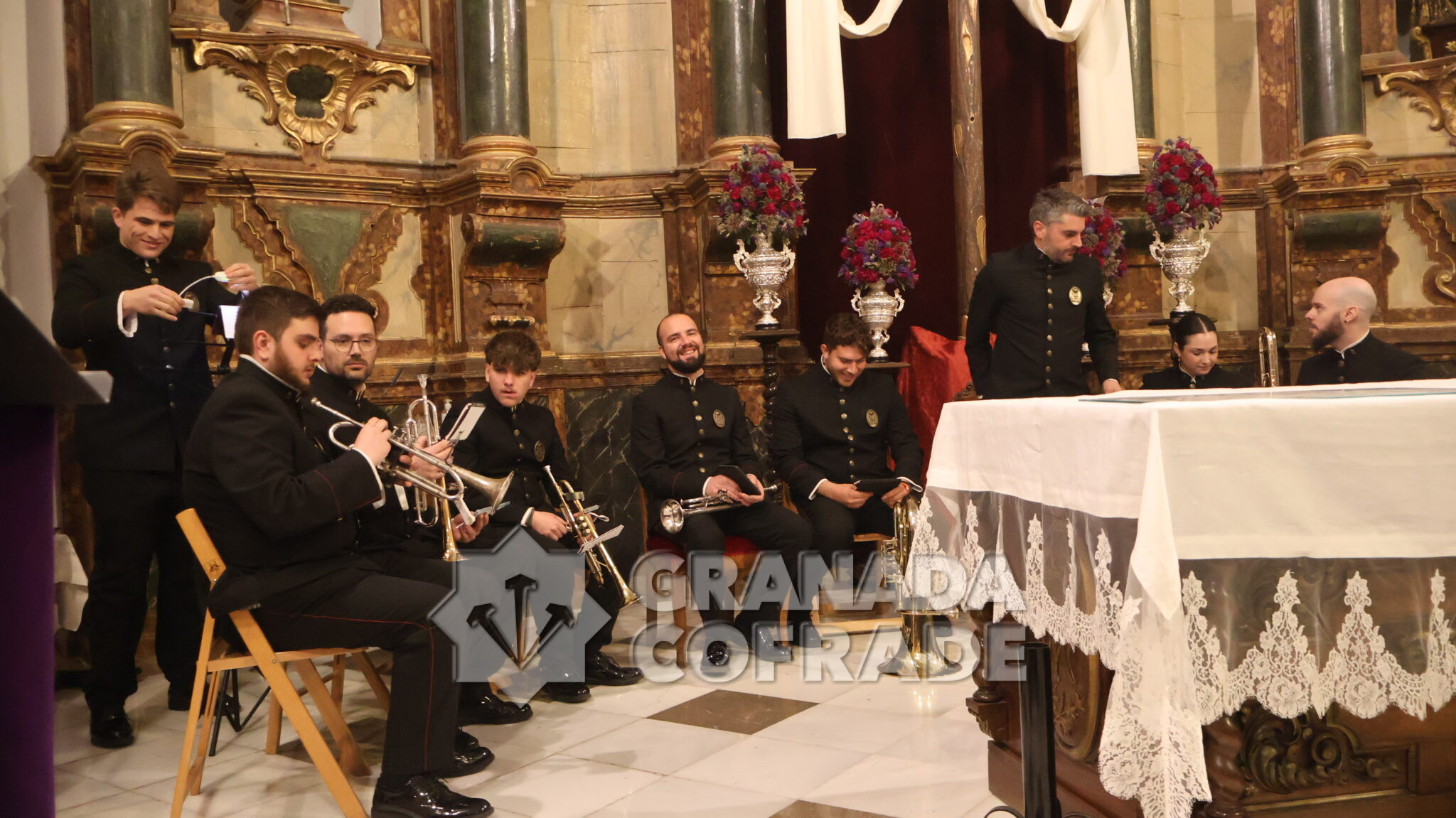 Portado por militares del Ala 78 de la Base Aérea de Armilla y con la participación del capitán Gerardo Mochón, se dispusieron a portar a la imagen del Crucificado, de Domingo Sánchez Mesa desde el presbiterio hasta el paso procesional bajo el coro del templo. Con el templo a oscuras y sólo iluminado por los ciriales del paso y la fila de hermanos jóvenes de la corporación se procedió al traslado de la imagen al paso. Estaba en el cortejo invitado el pregonero de la Semana Santa de 2026, Tito Ortiz, junto con las ediles Carolina Amate y Nani González, además de la presidencia con la hermana mayor, Fátima Sánchez, y el capitán Mochón.