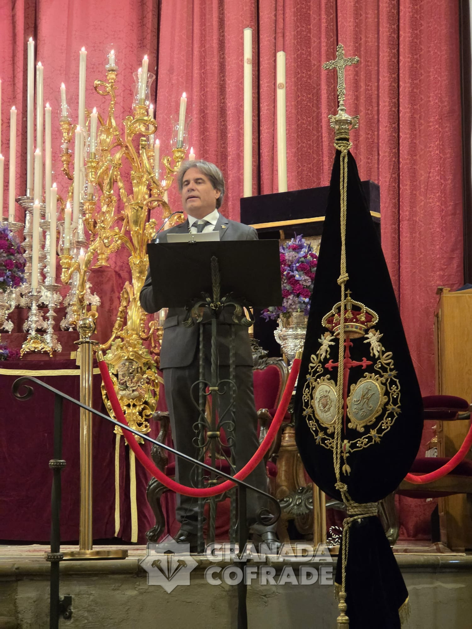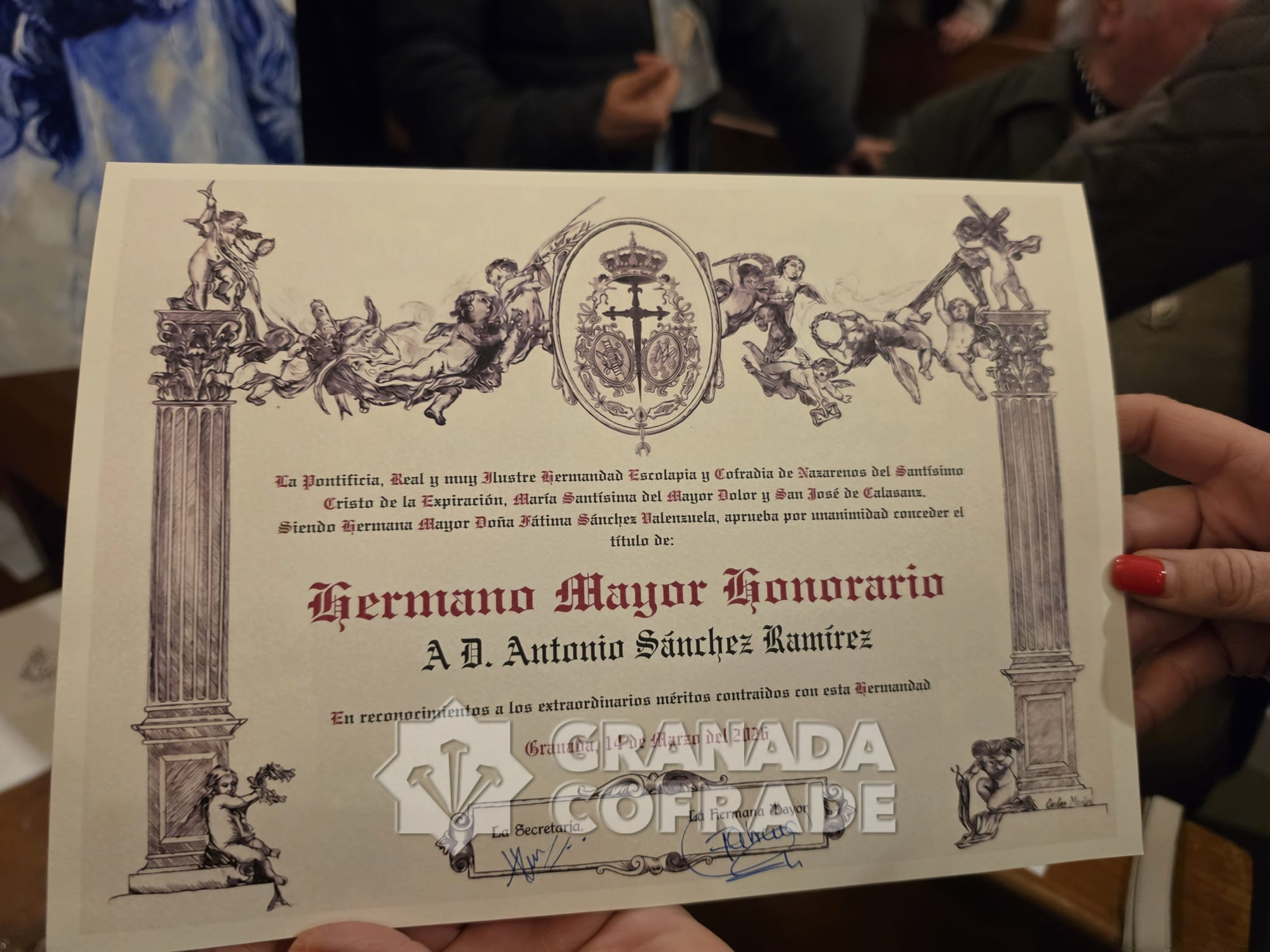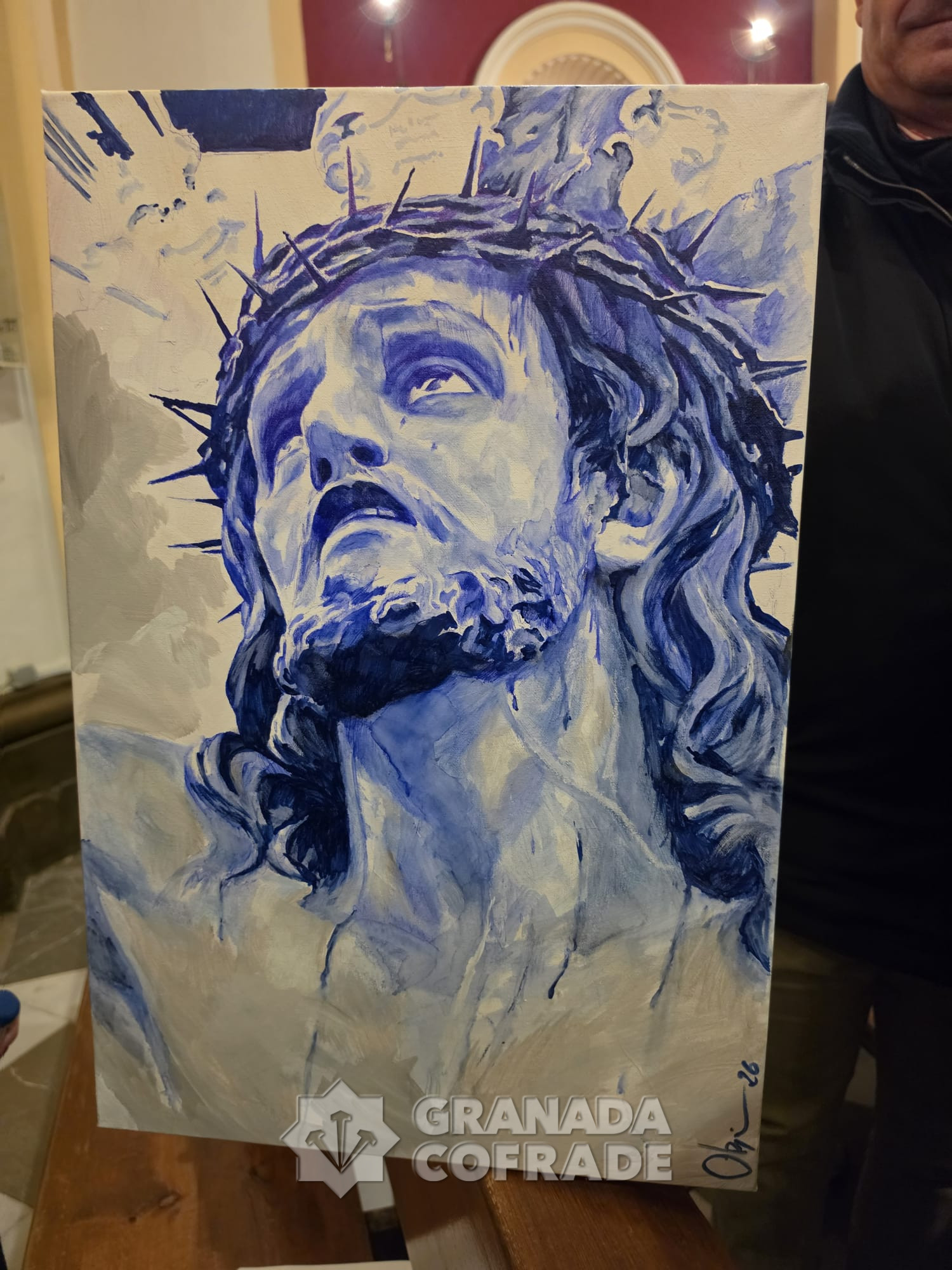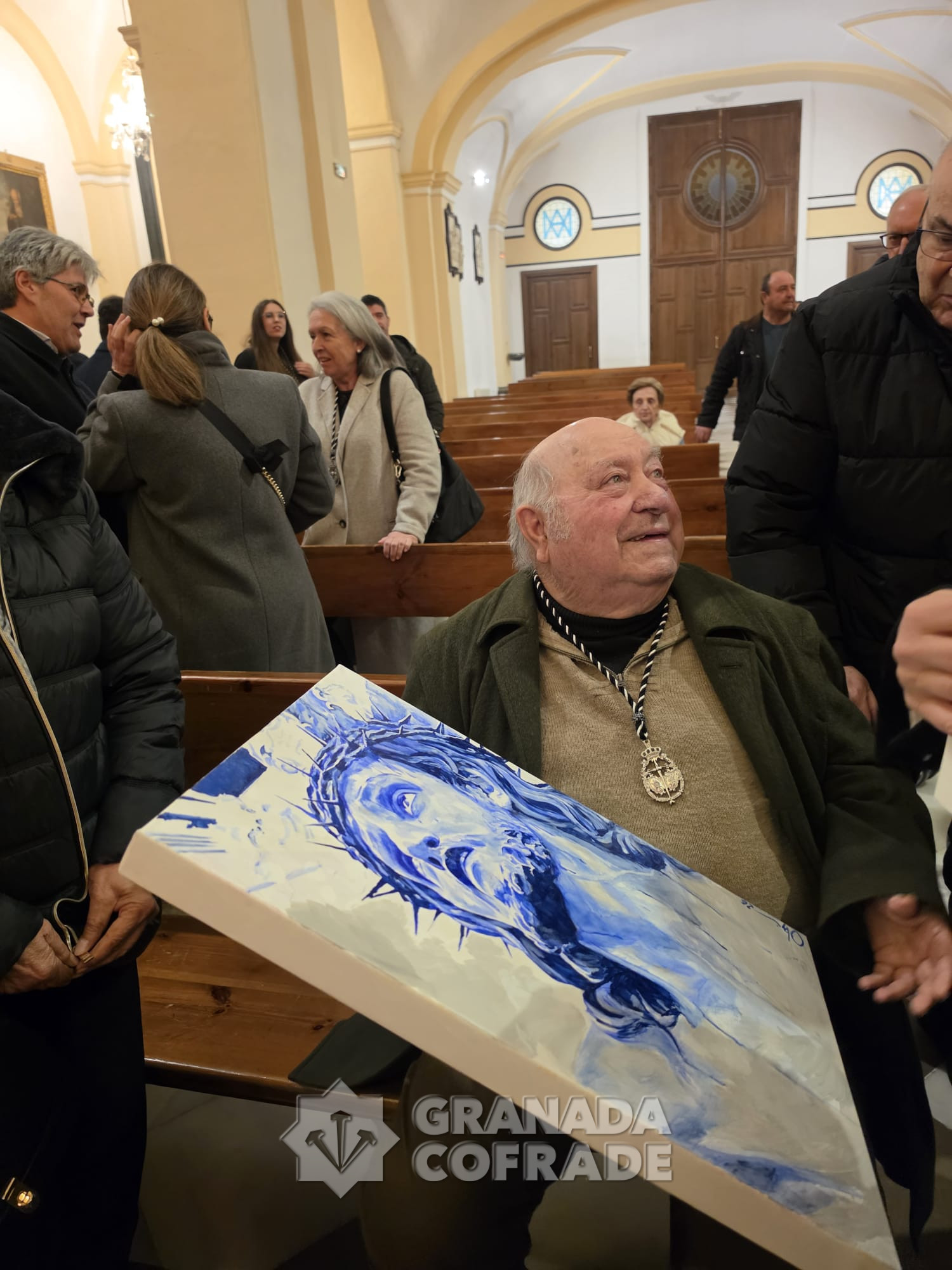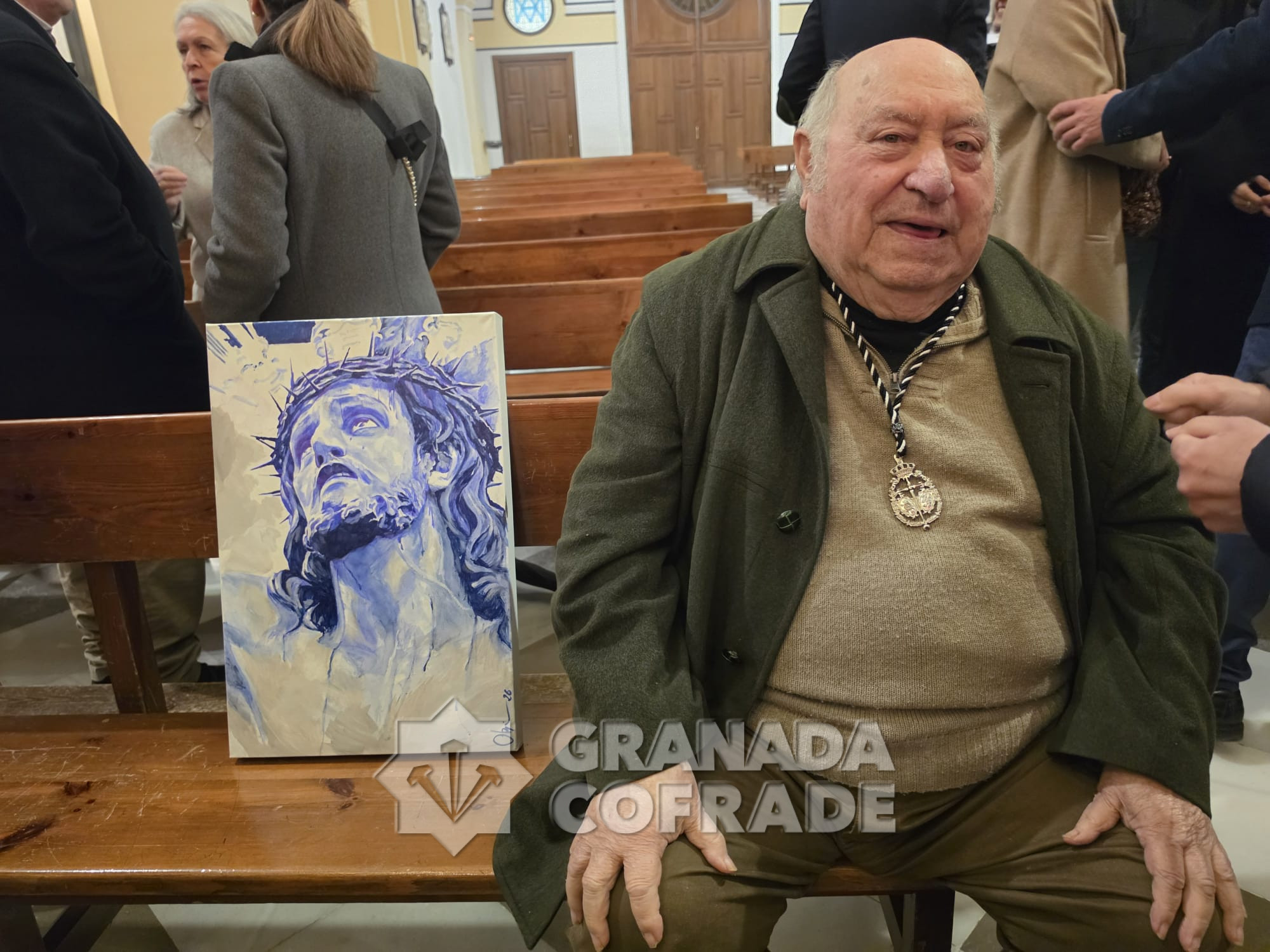 Manuel Obregón es el artista granadino que ha realizado un cuadro como regalo a Antonio Sánchez Ramírez que el pasado sábado presidió la Función de la Cofradía del Cristo de la Expiración. Antonio Sánchez, «El Compadre», fue quien, junto con otros hermanos de la cofradía, revitalizó la hermandad en el año 1980 consiguiendo ponerla nuevamente después de una década en las calles de Granada siendo su hermano mayor. Llegó también la fundación de la Hermandad de Gloria del Rocío de Granada pero también tuvo una labor destacada en el mantenimiento y salidas procesionales del Cristo del Consuelo y de su cofradía sacromontana. Ahora le ha llegado el momento de recibir el nombramiento de Hermano Mayor Honorario que la cofradía del Paseo de los Basilios quiso tener con él.