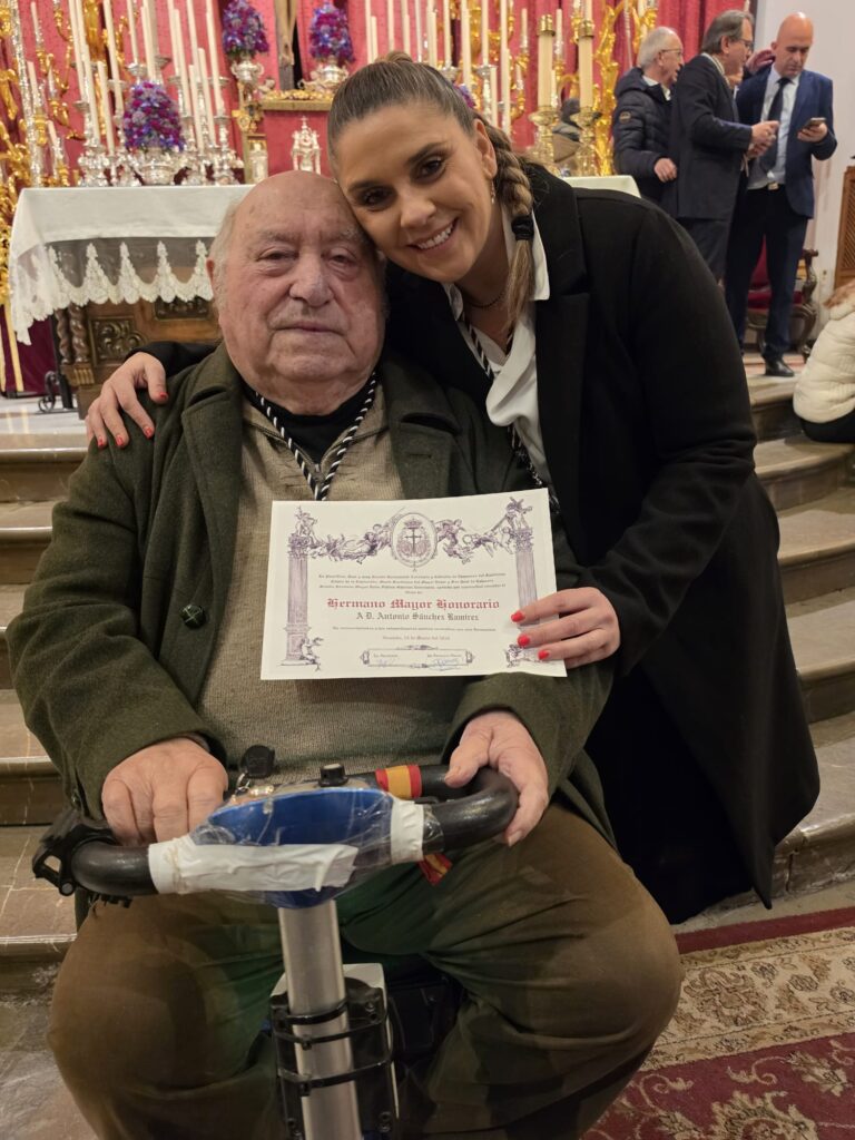 Fátima Sánchez, su hermana mayor, tuvo palabras para Antonio Sánchez Ramírez de gratitud y de complicidad por el trabajo desarrollado durante aquellos años, entregándole, junto con el autor de la pintura, el recuerdo por el trabajo en favor de la continuidad de esta corporación nazarena. Le entregó también el nombramiento «y aunque sabemos que la tienes, esta medalla simboliza todo el cariño y aprecio que te tenemos», indicó. «Gracias a ti estamos otra vez aquí y sólo pedimos a Dios que tu Cristo de la Expiración, la Madre del Mayor Dolor y la Virgen del Rocío te de muchas fuerzas para seguir muchos años con nosotros. Muchas gracias de corazón». Un largo aplauso y la emoción en el rostro hicieron el momento más entrañable aún al ver feliz al Hermano Mayor Honorario de esta cofradía que avanza gracias a los empujes que en su tiempo dieron nombres propios a la cofradía de orillas del Genil. «Yo trabajé pero también sembré una semilla que ha germinado con vosotros», dijo el Hermano Mayor Honorario. «Yo le digo a Cristo que me aguante lo que pueda» recitando también un poema a la Virgen del Rocío.