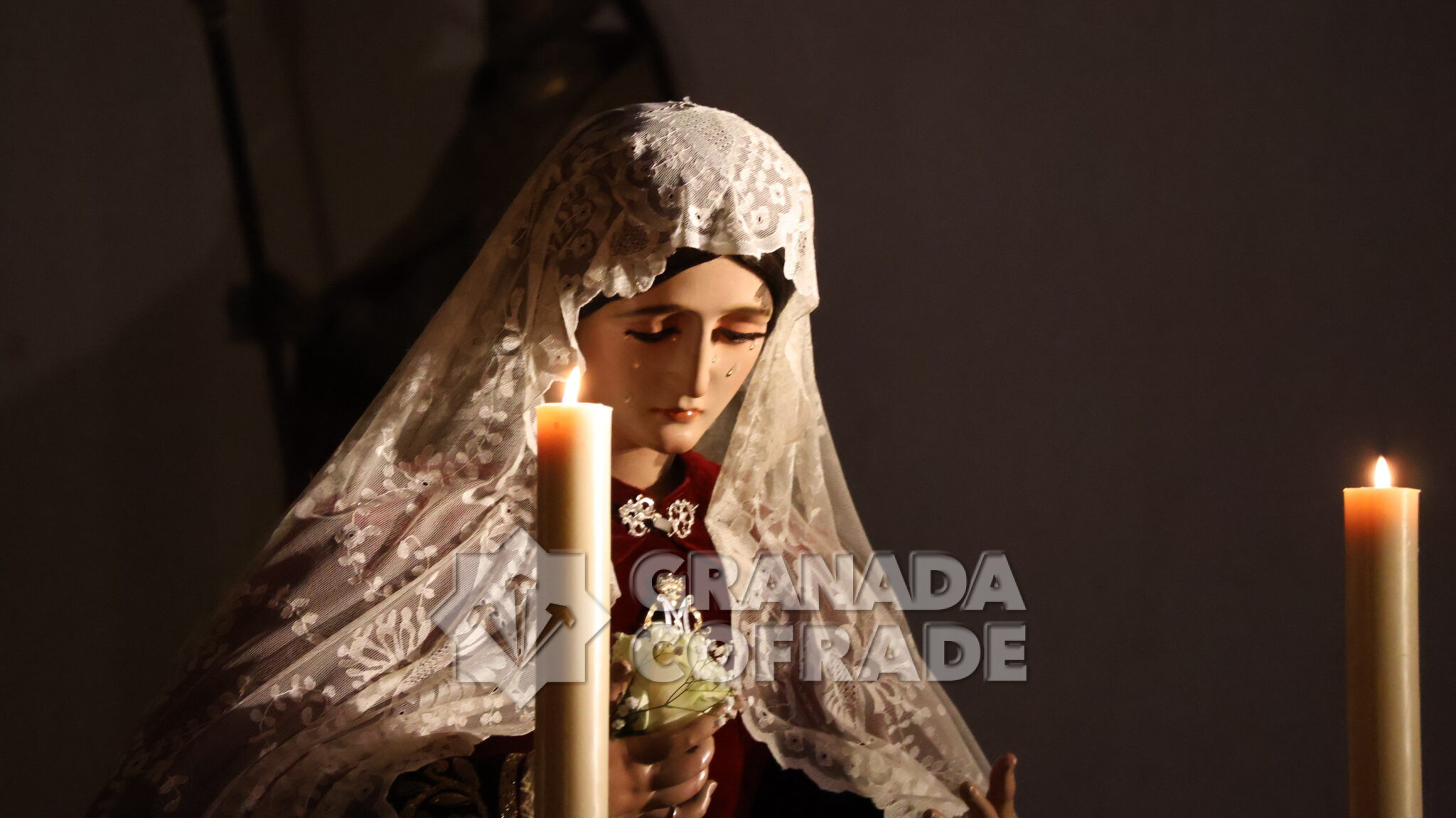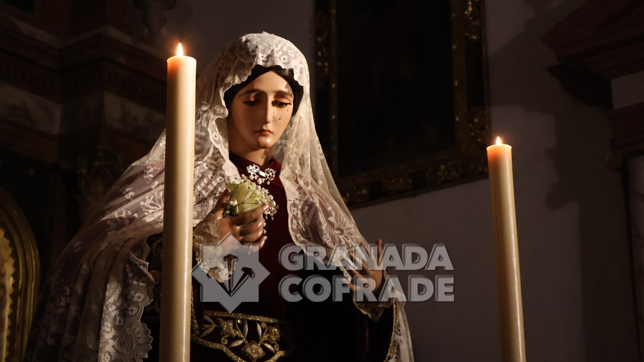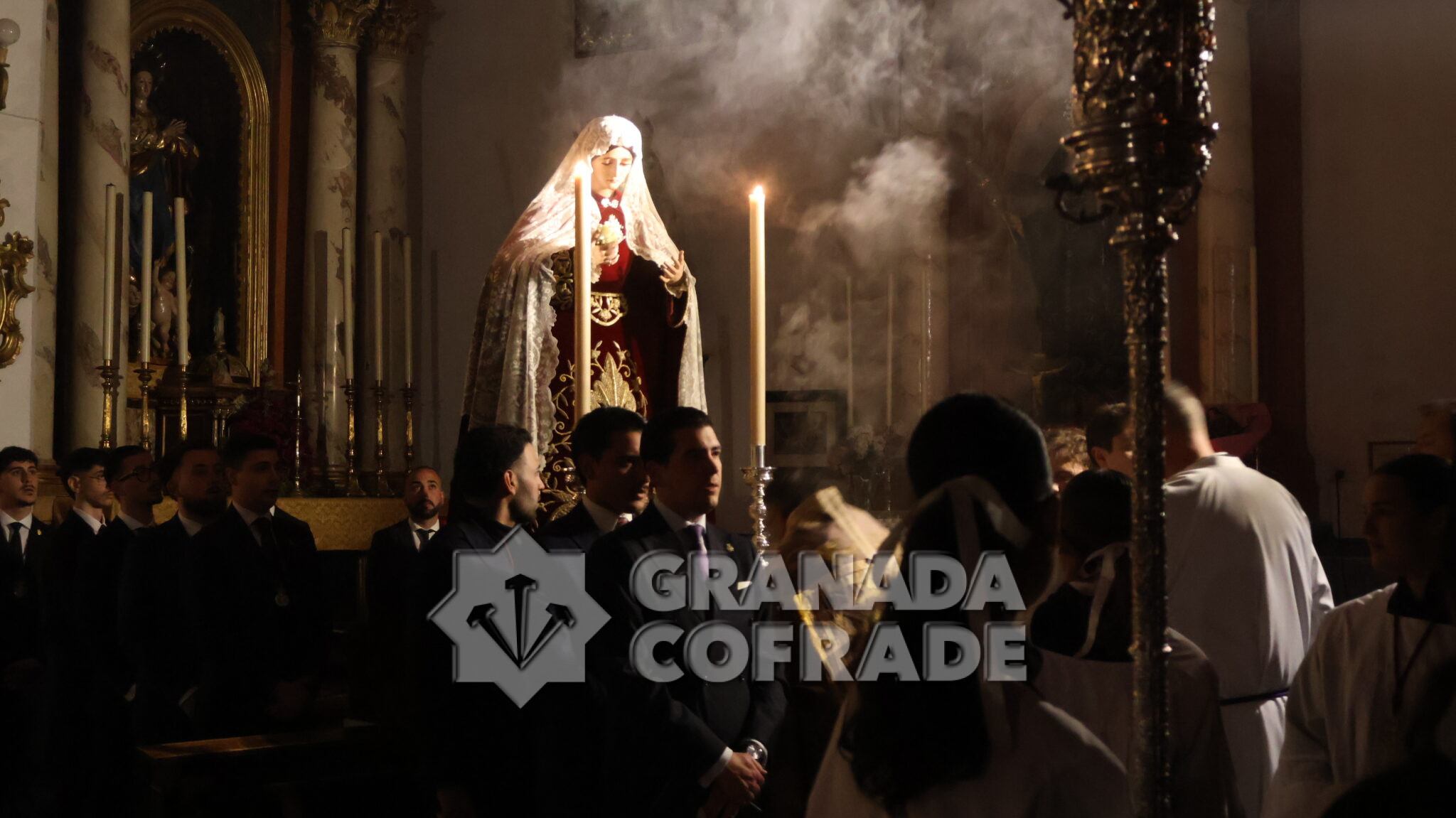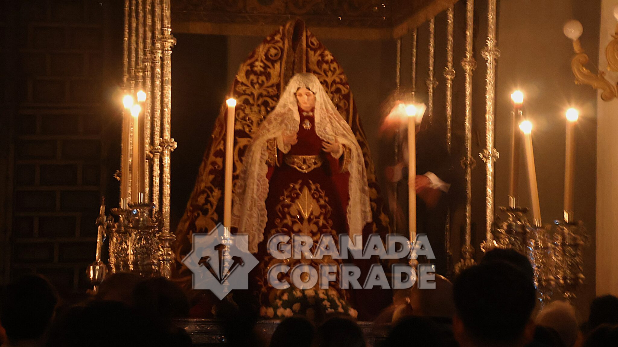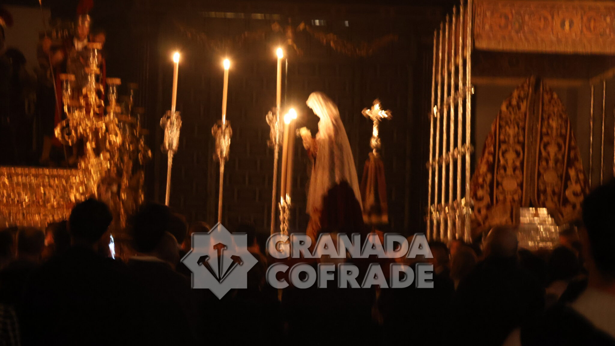 Estaba la Santísima Virgen de las Maravillas junto al presbiterio y esperando para solemnizar el momento la capilla musical y tenor para entonar temas como el «Ave María» o el «Mater Lacrimosa», mientras avanzaba por la nave principal del templo de San Pedro y San Pablo, portado en andas por costaleros de la hermandad y un absoluto recogimiento y silencio rodeaba el momento, consiguiendo un ambiente de extraordinaria belleza en torno a la Santísima Virgen y de oración al orar ante su Hijo de la Sentencia. Después, con delicadeza fue depositada en su paso de palio donde tan sólo restaba ya subirla sobre la peana y cubrirla con su manto para que Granada contemple las «Maravillas de Dios».
