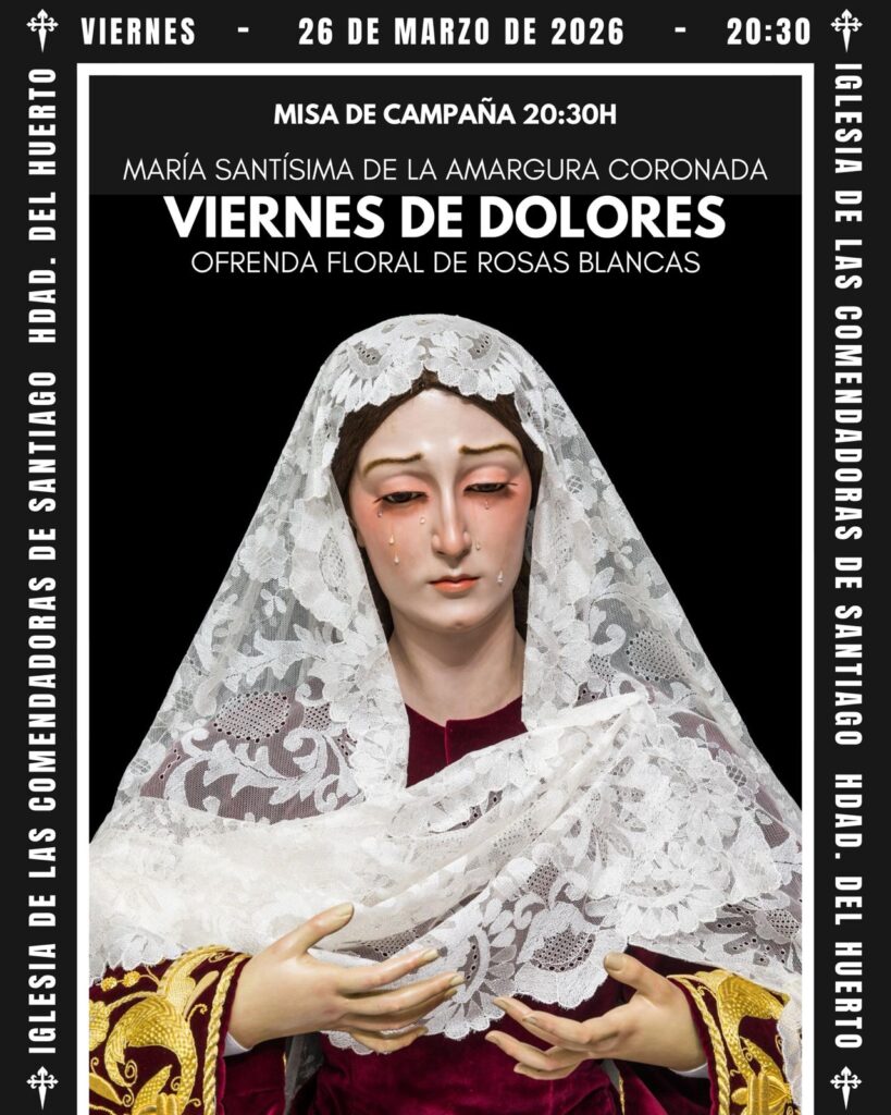 La Hermandad de la Oración de Nuestro Señor en el Huerto de los Olivos celebrará, como cada año, la Santa Misa de Indulgencias mañana Viernes de Dolores a las 20:30 horas, presidida por María Santísima de la Amargura Coronada en su Paso de Palio. Previamente, a partir de las 20:00 horas, tendrá lugar una ofrenda floral. Para facilitar la participación de hermanos y fieles, la Hermandad habilitará un punto de venta de flor blanca en la puerta de la Cofradía.