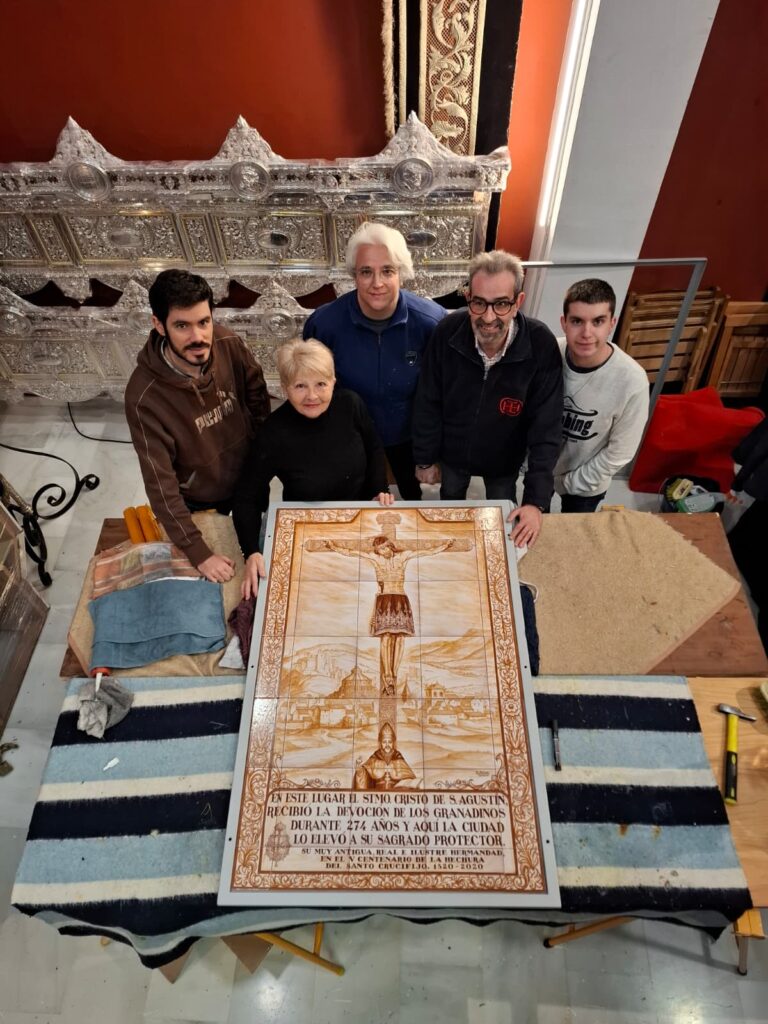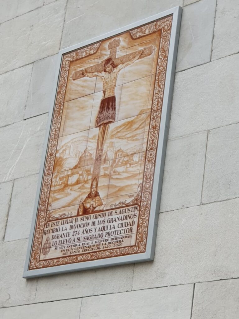 «En este lugar el Santísimo Cristo de San Agustín recibió la devoción de los granadinos durante 274 años y aquí la ciudad lo elevó a su Sagrado Protector» reza la leyenda del mosaico recordando que se coloca con motivo del V Centenario de su hechura 1520-2020.