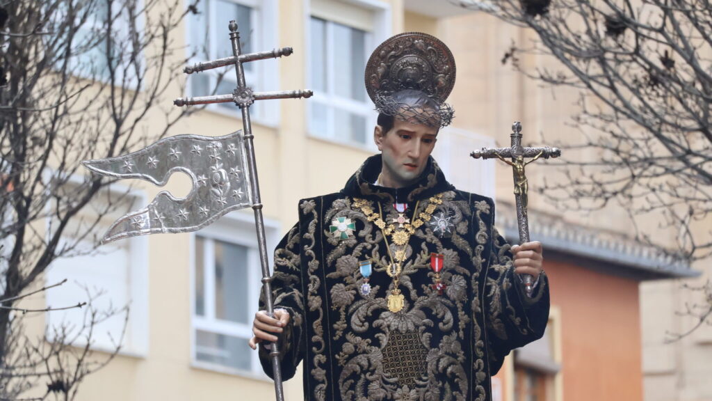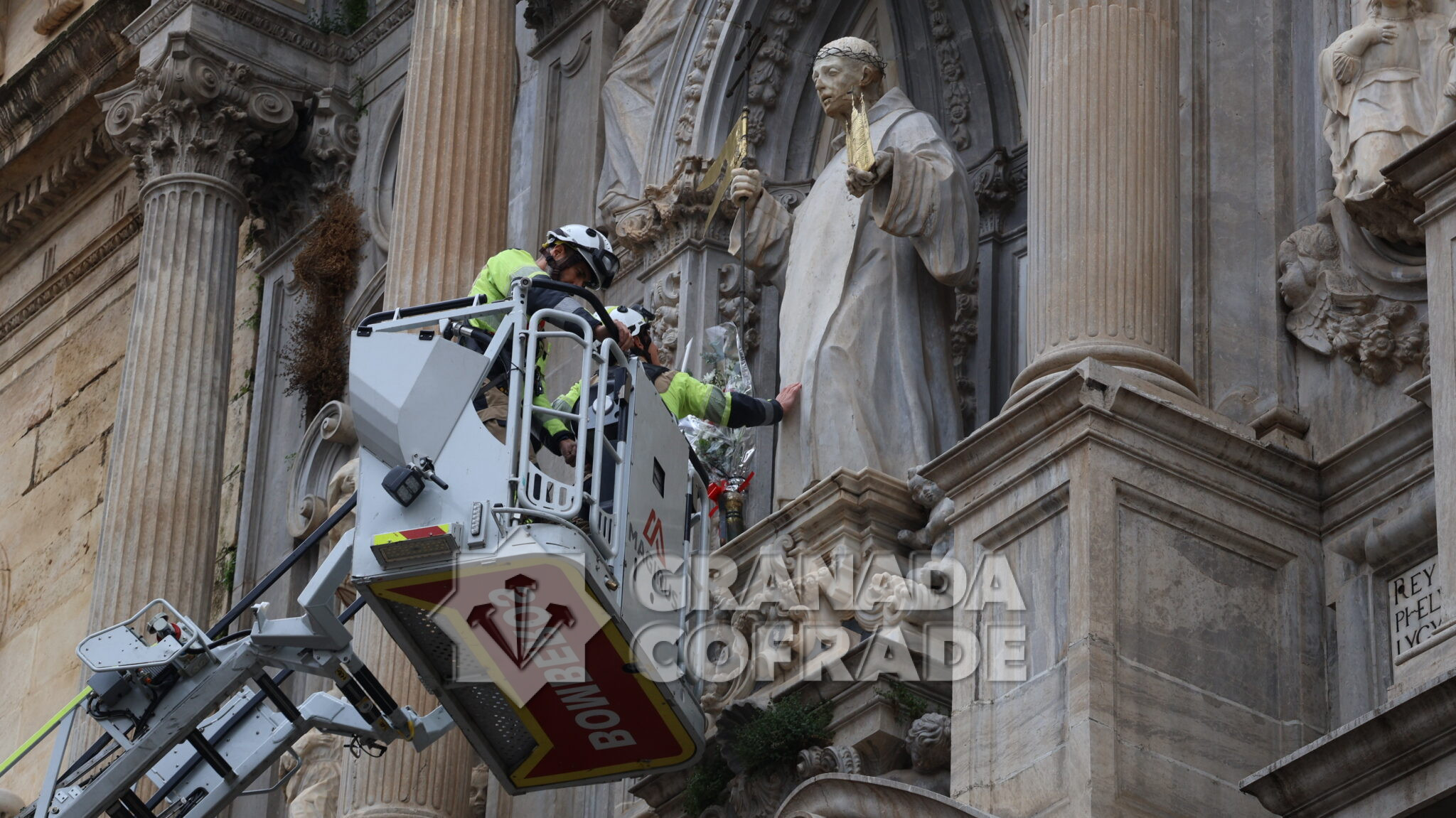 Procesionó la imagen de San Juan de Dios, obra de Francisco Bernardo de Mora, del siglo XVII, por las calles de centro de la ciudad en medio de alguna incertidumbre meteorológica. El cielo estaba ciertamente gris y la información meteorológica ofrecía la posibilidad de lluvia para la tarde, algo que finalmente no ocurrió. Los Bomberos, que tienen por patrón a San Juan de Dios realizaron una ofrenda a la imagen de la fachada y nada más retirarse la escala y el vehículo auxiliar salió la cruz de la basílica camino de su recorrido por el itinerario previsto.