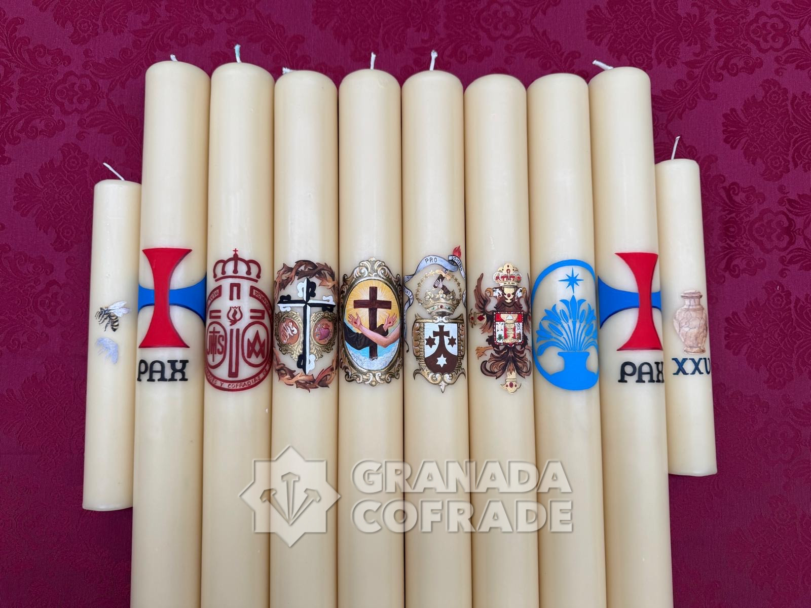 Completan el programa iconográfico de la cera las dos velas que anteceden e iluminan los faroles delanteros del paso de palio. En ellas se ha representado una abeja, símbolo de la miel y de la dulzura, en clara alusión al Dulce Nombre de María y a la ternura y suavidad que la tradición cristiana atribuye a la Santísima Virgen bajo esta advocación. Junto a ello, también se ha pintado un tarro de esencias, elemento iconográfico vinculado a Santa María Magdalena, con motivo del XXV aniversario de la hechura de la imagen que acompaña a Nuestro Padre Jesús Despojado en su paso de misterio.