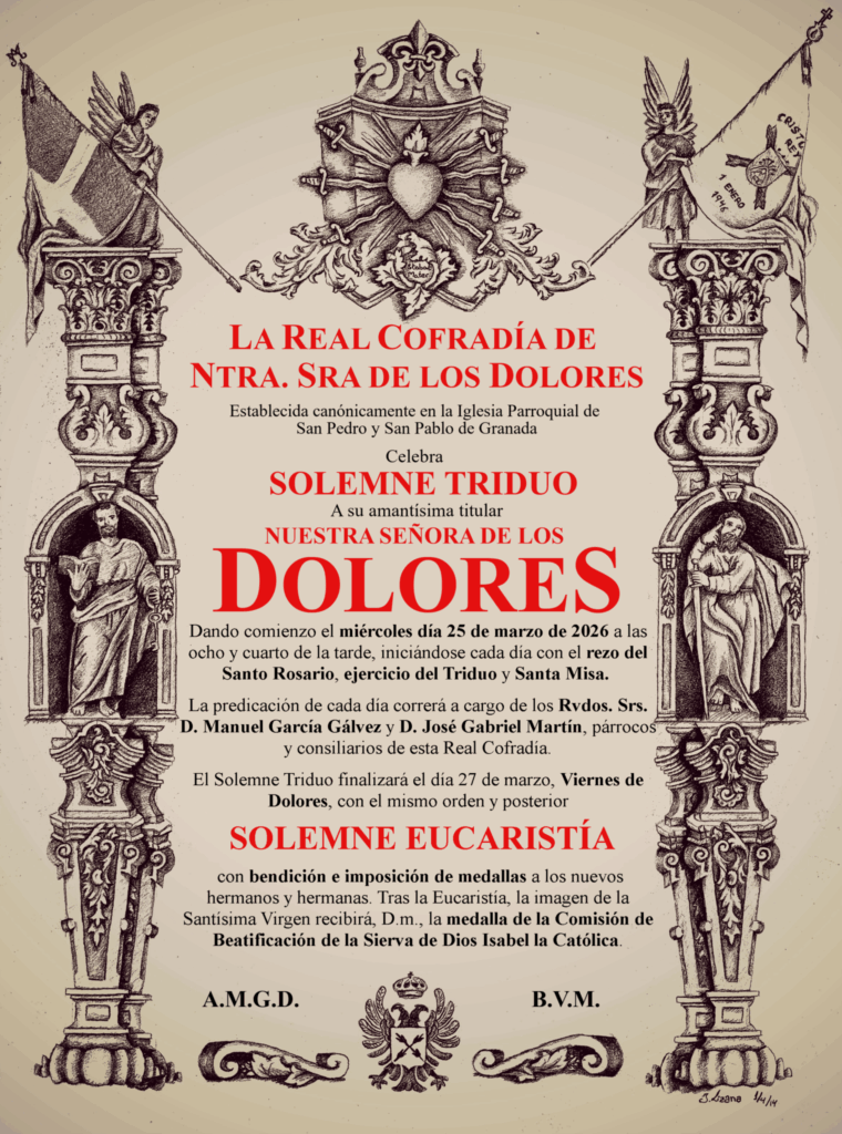 Comenzó ayer miércoles día 25 el triduo en honor a la Virgen de los Dolores que se prolonga hoy jueves, día 16 y mañana viernes 27 de marzo, en la Iglesia Parroquial de San Pedro y San Pablo. Cada día da comienzo a las 20:15 horas con el rezo del Santo Rosario, ejercicio de Triduo y Solemne Eucaristía a las 21 horas.El día 27 de marzo, tercer día del Triduo y Viernes de Dolores, se celebrará Función Principal, con la predicación en la solemne Eucaristía de los José Gabriel Martín Rodriguez y Manuel García Gálvez . Durante el desarrollo de esta solemne Eucaristía se procederá a la Imposición de Medallas a los nuevos Hermanos, así como a aquellos que, aunque lo sean de años anteriores, no la tengan impuesta y hayan expresado su deseo de que se les imponga. Una vez finalizada la solemne Eucaristía, la Santísima Virgen de los Dolores, recibirá la medalla de la Comisión de Beatificación de la sierva de Dios Isabel la Católica.