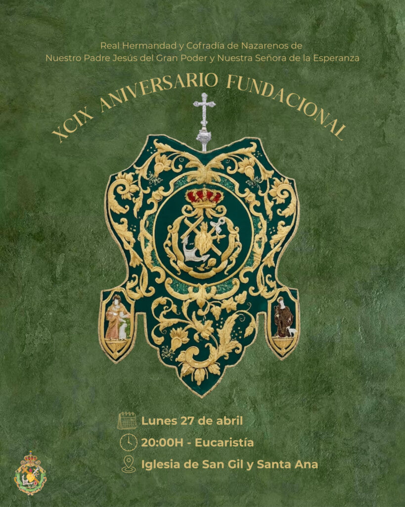 Celebra la cofradía de Jesús del Gran Poder y Nuestra Señora de la Esperanza el nonagésimo noveno aniversario de su fundación, ocurrida en el año 1927 y la cofradía para ello ha dispuesto, como cada año, la función Eucarística en su sede canónica de la parroquial de San Gil y Santa Ana. Será el lunes próximo a las ocho de la noche.