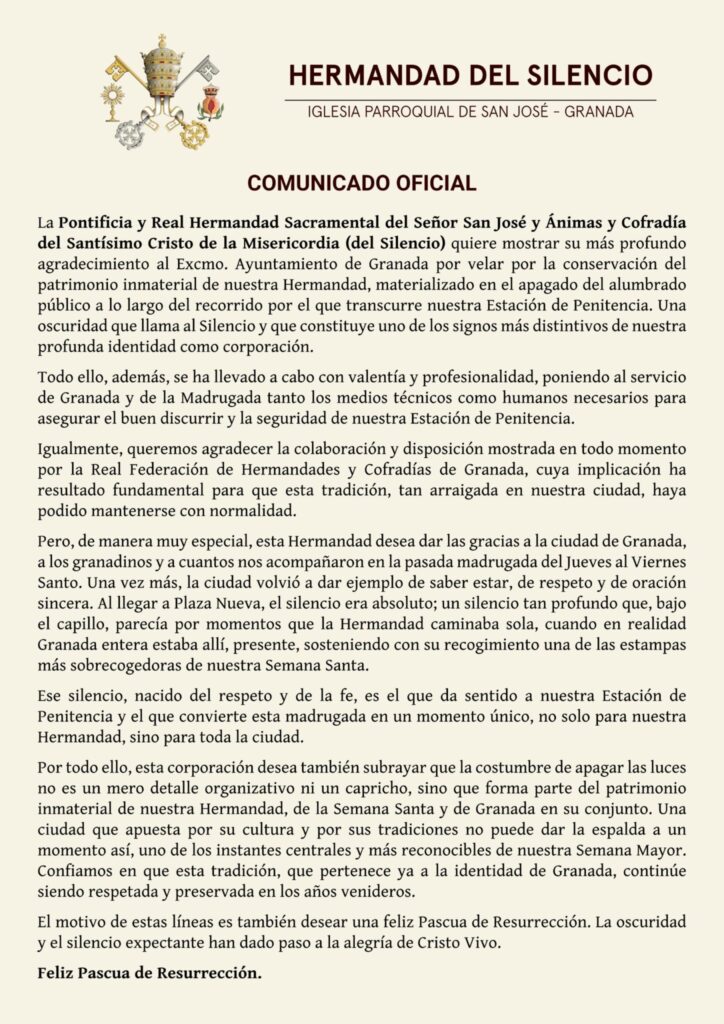 La cofradía del Silencio ha mostrado a través de un comunicado remitido a nuestra redacción «su más profundo agradecimiento al Excmo. Ayuntamiento de Granada por velar por la conservación del patrimonio inmaterial de nuestra hermandad, materializado en el apagado del alumbrado público del recorrido por el que transcurre nuestra Estación de Penitencia». Desde la junta de gobierno se asegura que esta tradición «constituye uno de los signos más distintivos de nuestra profunda identidad como corporación».
