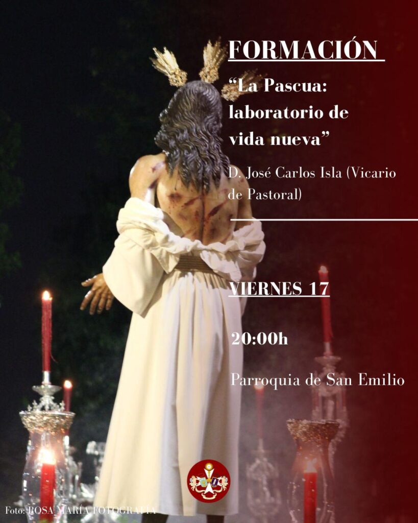 Desde la vocalía de formación de la hermandad de Nuestro Padre Jesús Despojado de sus Vestiduras se convoca para el próximo viernes, 17 de abril, en la parroquia de San Emilio, del barrio Figares, en calle Agustina de Aragón, una charla de formación para los hermanos y los interesados en participar.Será a las ocho de la noche y correrá a cargo de José Carlos Isla, vicario de Pastoral de la Diócesis de Granada. El título es «La Pascua: laboratorio de vida nueva».