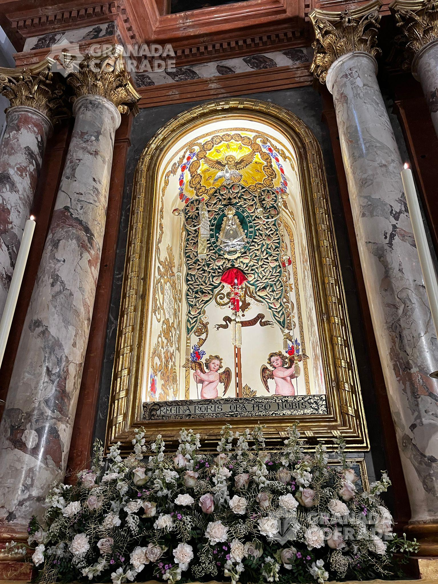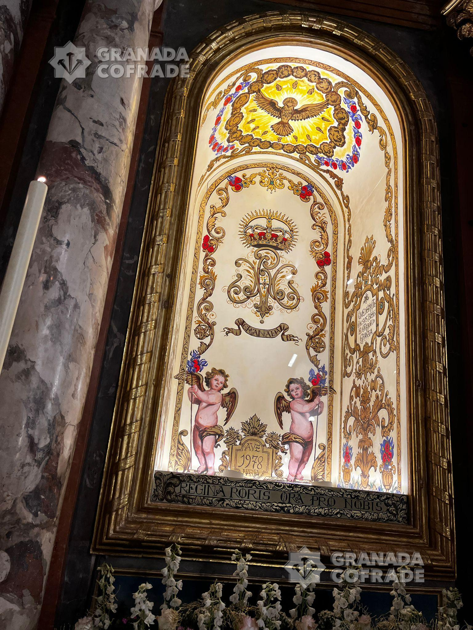 La hermandad del Rocío de Granada vivió ayer una mañana histórica en la que se alcanzó un deseo de la hermandad como era la reforma de la hornacina en la que se conserva y venera el Simpecado de la hermandad. Primero fue la celebración de la Eucaristía presidida por el consiliario, José Gabriel Martín en la que hizo referencia al deseo de la hermandad para afrontar este deseo reflejado en el lugar en el que tradicionalmente se conserva el Simpecado y en el que se han aplicado pinturas murales «con fuerte referencia mariana». Este proyecto se ha sufragando con donaciones de los hermanos y devotos.