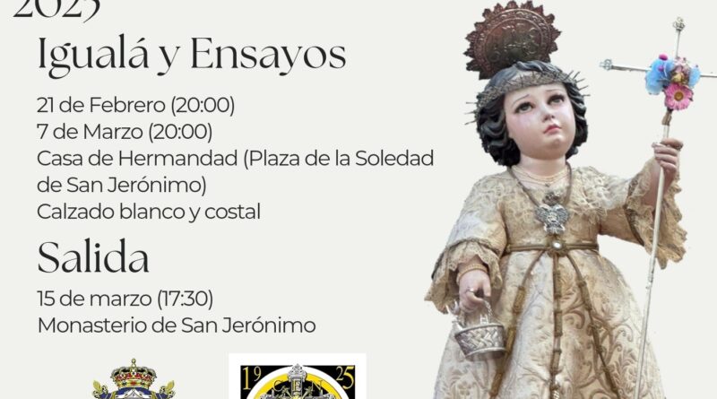 La salida procesional infantil cuenta con la realización de un nuevo paso procesional en el que se trabaja en la actualidad y estará precedida por los ensayos de la cuadrilla previstos para los días 21 de febrero, viernes, a las ocho de la noche y el 7 de marzo, también viernes, a la misma hora. La cita es en la plaza de Nuestra Señora de la Soledad de San Jerónimo, en su casa de hermandad. Es necesario acudir con calzado blanco y costal.
