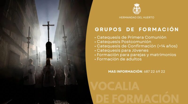 La vocalía de Formación de la hermandad de la Oración de Nuestro Señor en el Huerto de los Olivos ha iniciado la apertura de inscripción en los grupos de formación para este curso 2025/26. Están dirigidos a  niños, jóvenes, adultos y matrimonios, en el marco del curso pastoral 2025-2026 y el contenido de los mismos es para Catequesis de Primera Comunión, Catequesis de Postcomunión, Catequesis de Confirmación a partir de los catorce años, Catequesis para Jóvenes (reunión mensual), Formación para Parejas y Matrimonios (reunión mensual) y Formación de Adultos (reunión mensual).